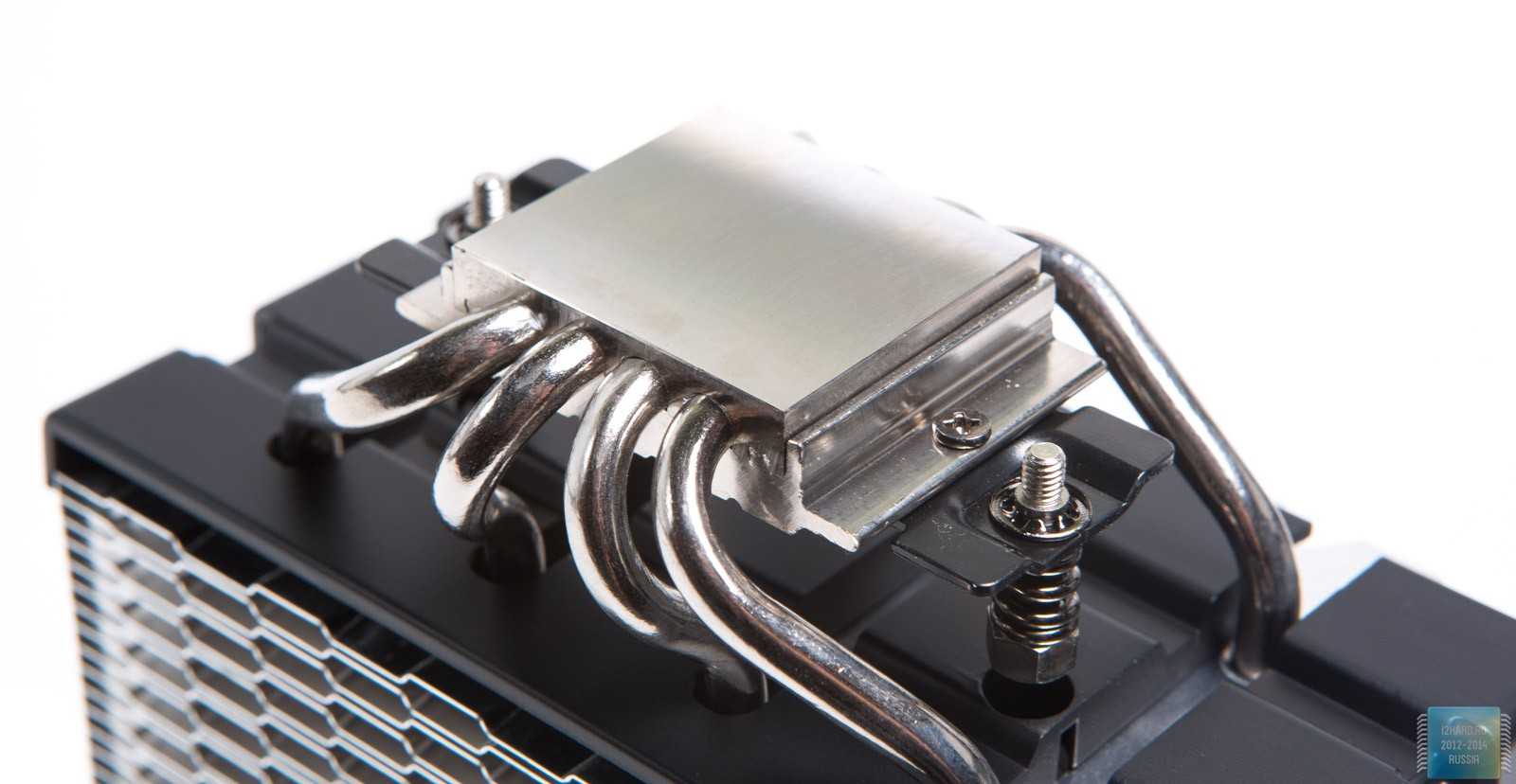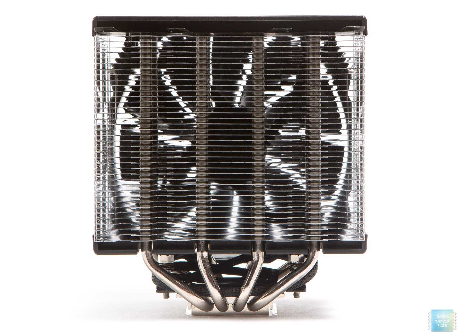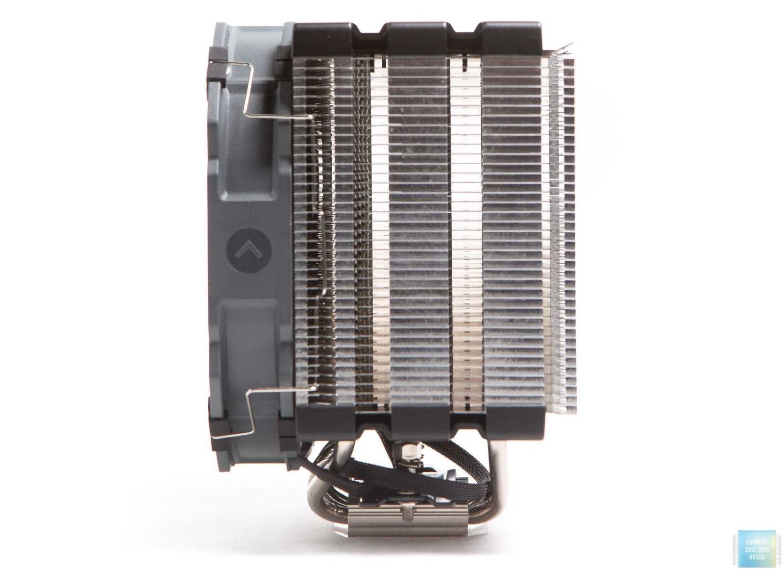 В конструкции используются 39 широких алюминиевых пластин, насаженных на тепловые трубки. Расстояние между пластинами равно 2,8мм, это позволит использовать вентиляторы с невысоким уровнем статического давления. Верхняя и нижняя пластины закрыты пластиковыми накладками.