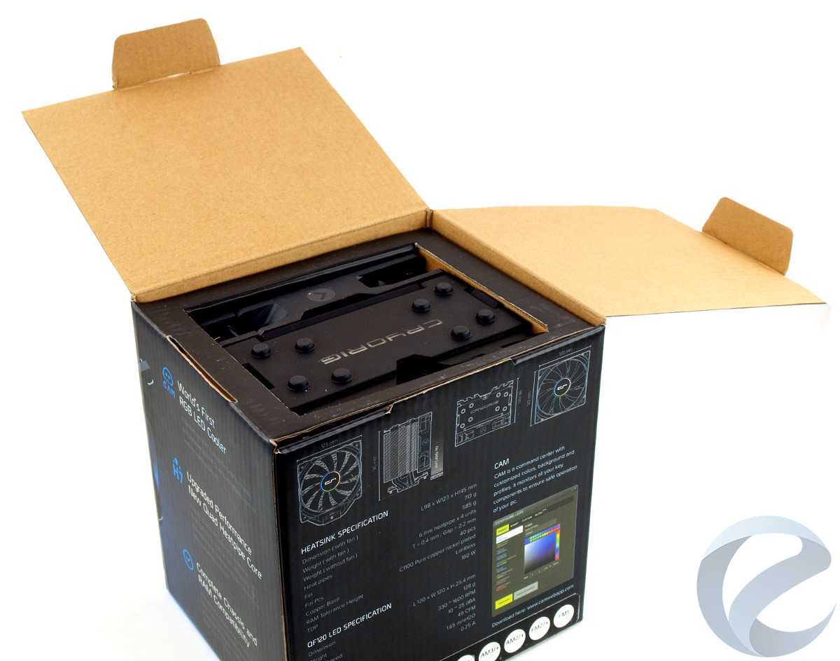 Упаковка открывается через верхнюю кромку и выполнена из картона. На обозрение появляется процессорный кулер с вентилятором, а комплект поставки прячется в нише под ним.