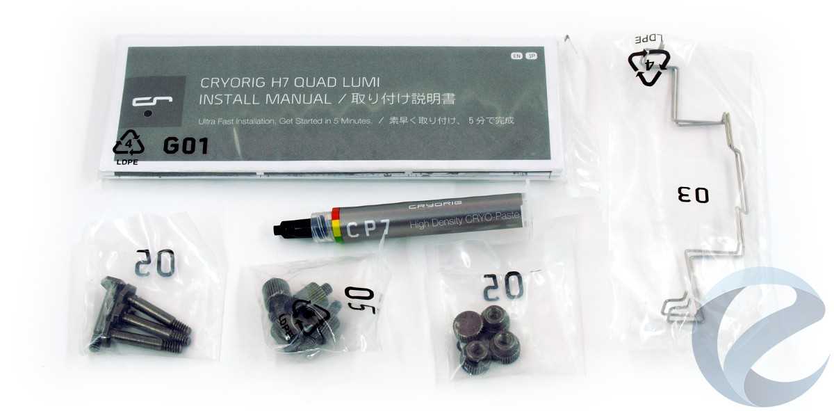 Комплектация достаточно богата и разнообразна. Внее входит руководство пользователя, карточка участника клуба Cryorig (после регистрацииувеличение гарантии до 3 лет), тюбик с термопастой CP7 (в иерархии компании средний представитель), крепления для второго вентилятора и радиатора на материнской плате.