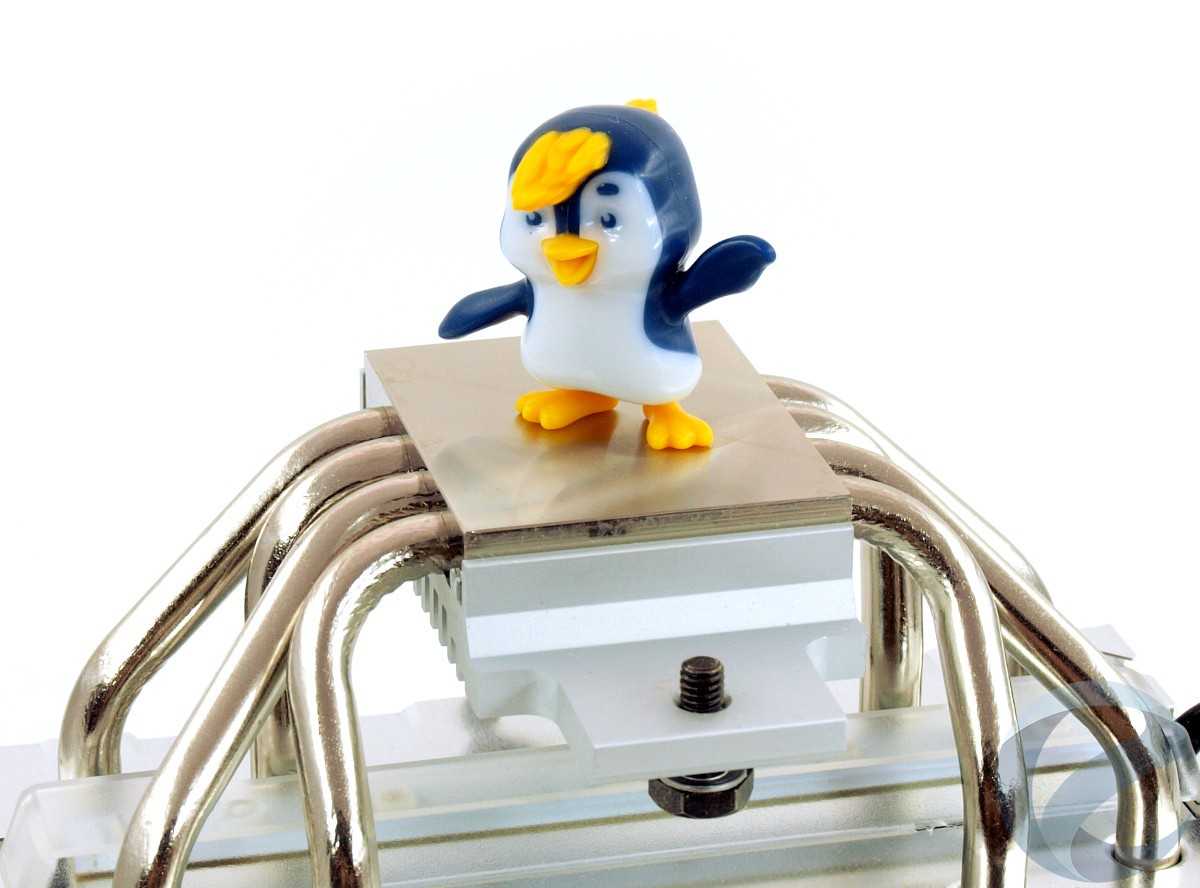 «Подошва» кулера состоит из двух пластин, вставленныхв пазы без следов пайки. Верхняя, выступающая в роли низкопрофильного радиатора, является крепежной рамкой.