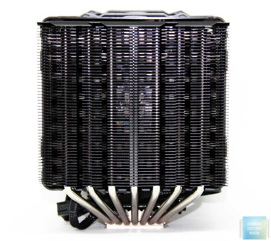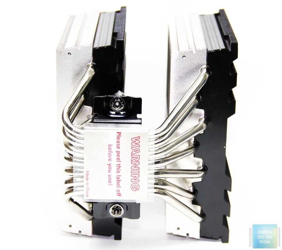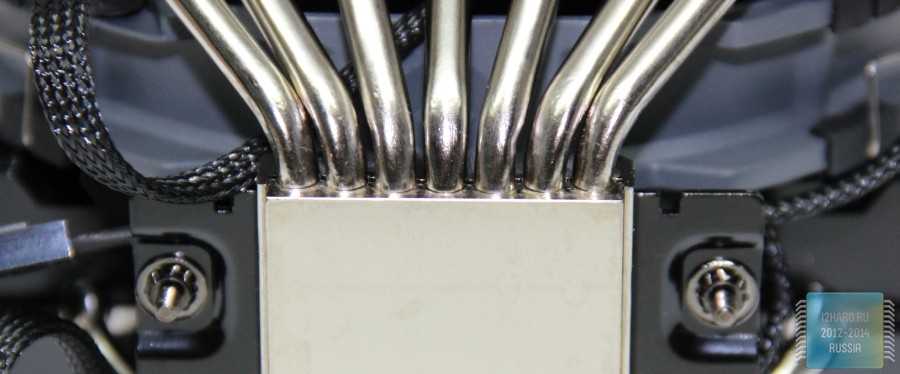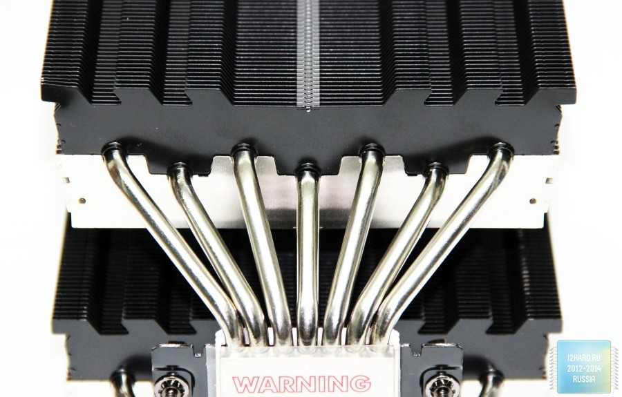 В конструкции Cryorig R1 Ultimate используется семь 6 мм тепловых трубок. Выходя из основания теплосъёмника, они равномерно распределяются по секциям двух радиаторов.