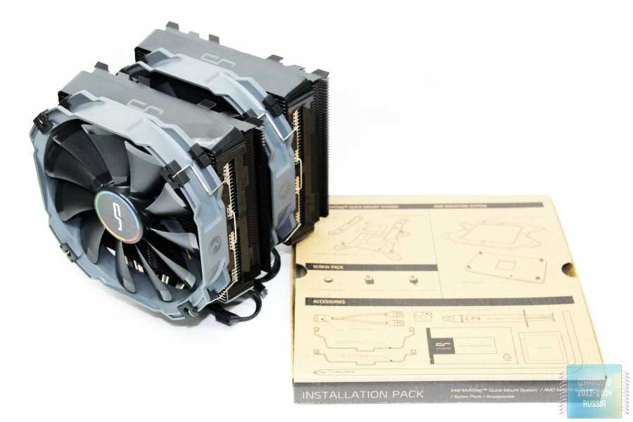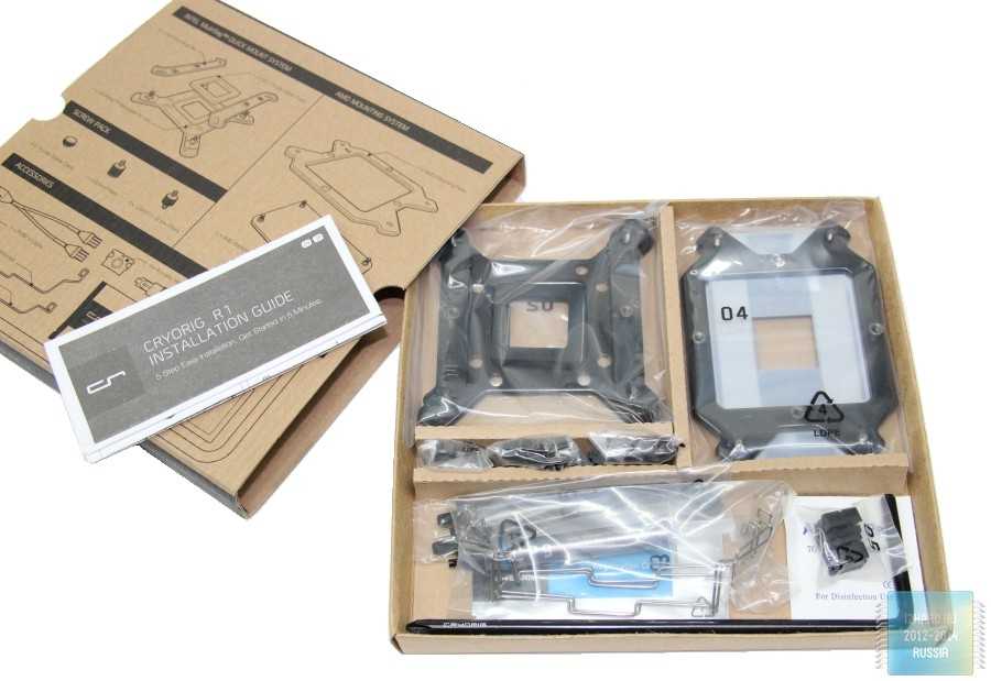 Содержимое упаковки разделено на две отдельные коробки. В одной находится кулер и вентиляторы, в другой, именуемой “Installation Pack”, расположены все необходимые аксессуары. Cryorig R1 Ultimate уже поставляется в готовом собранном виде, то есть вентиляторы уже смонтированы на кулер.