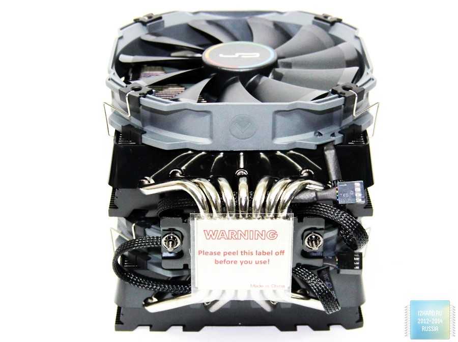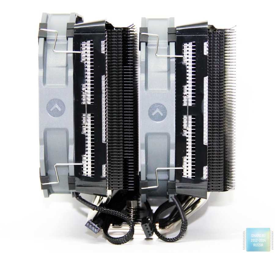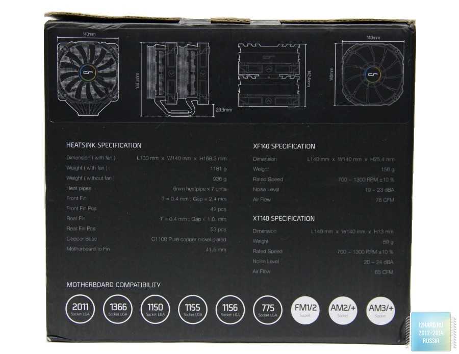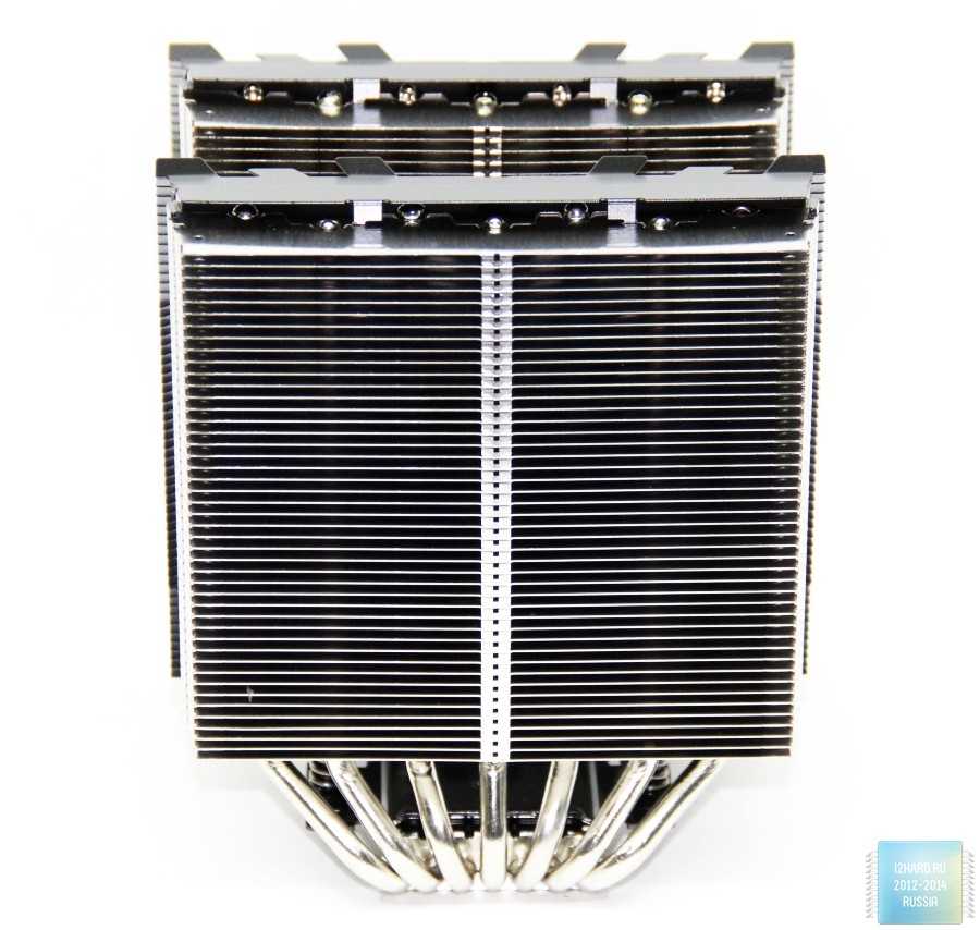 Радиатор алюминиевый, основание цельное медное, расстояние от радиатора до системной платы равно 41.5мм. Обдувом первой «башни» занимается вентилятор XF140, этот аппарат имеет размеры 140x140x25.4мм, весит 156 граммов, его лопасти вращаются на скорости от 700 до 1300 ±10 % об/мин, гоняя до 76 кубических футов воздуха в минуту, при шуме от 19 до 23дБ.