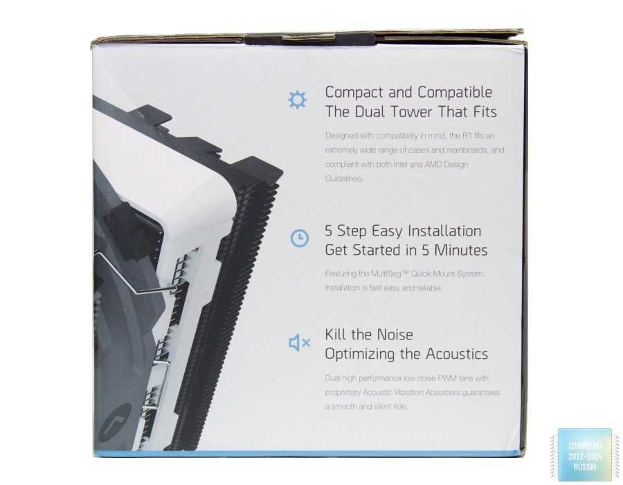 На одной из сторон упаковки нанесено фото самого кулера, а на другой — указаны основные особенности R1 Ultimate.