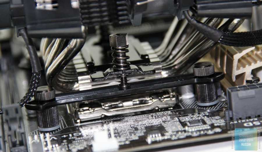 Фиксируем лапы с помощью четырех шайб и прикручиваем сам кулер с помощью комплектной отвертки к установленным лапам. Причем для того, чтобы прикрутить сам кулер к крепежной конструкции на материнской плате, не понадобится даже снимать вентиляторы. Инженеры предусмотрели конструкцию кулера так, чтобы отвертка доставала до винтов прижимной пластины без демонтажа вентиляторов с радиатора.