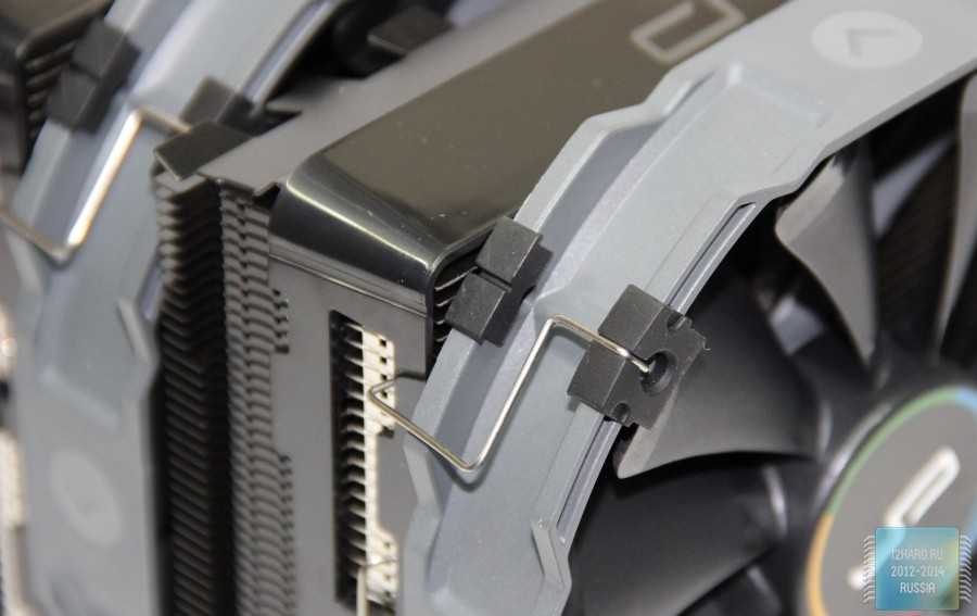 Вентиляторы системы охлаждения крепятся к секциям радиаторов с помощью металлических скоб. Сам механизм крепежа не является чем-то революционным, но, тем не менее, о нем стоит упомянуть отдельно. Дело в том, что каждая из секций радиатора оснащается черной пластиковой накладкой. А вентиляторы крепятся скобами уже за корпус этих пластиковых накладок, а не к самому радиатору. Для снижения вибрации во время вращения вентиляторов, их корпус в местах контакта с металлическими скобами оснащен специальными резиновыми вставками.
