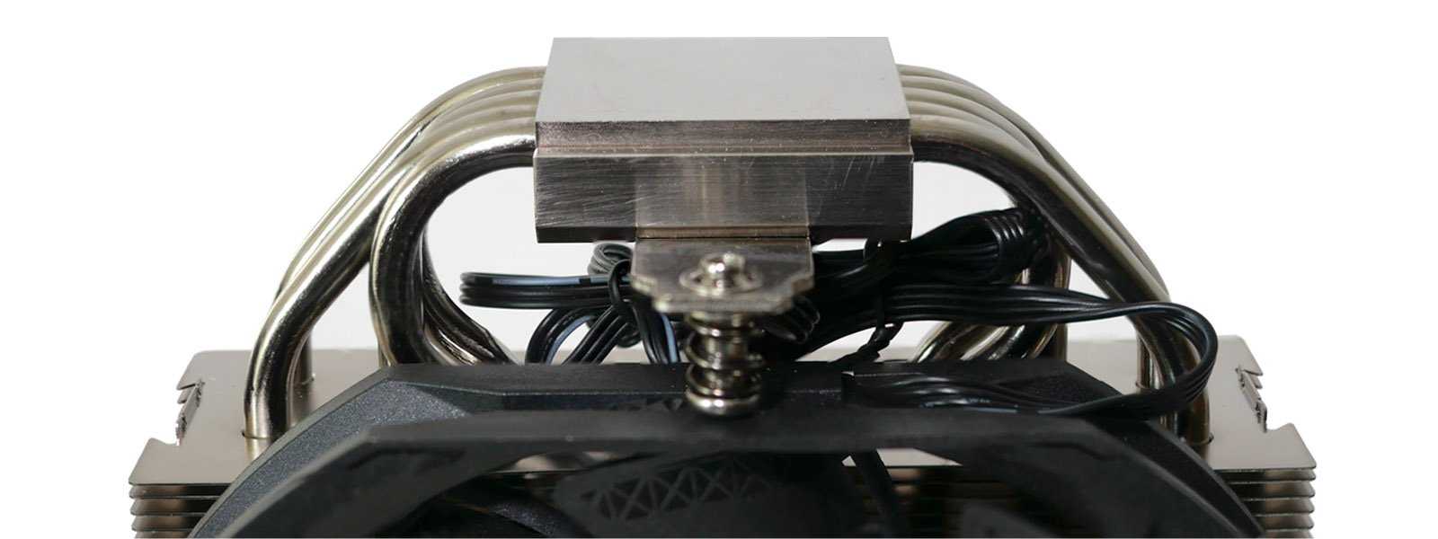 Шесть медных тепловых трубок диаметром 6 мм проходят через основание и равномерно распределены внутри двух «половинок» радиатора.