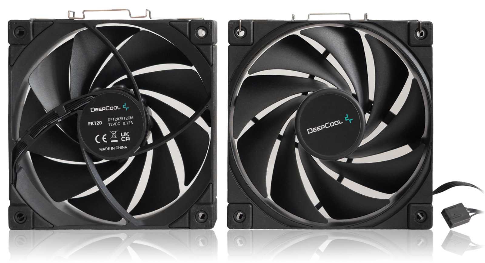 Deepcool AK620 продаётся с двумя предустановленными одинаковыми девятилопастными вентиляторами Deepcool FK120. Они имеют типовой размер 120 х 120 х 25 мм и дополнительно оснащены резиновыми демпферами по углам рамы, увеличивающими толщину в этих местах на 2 мм. Точная маркировка согласно наклейке на обратной стороне мотора — DF1202512CM. Подключение вентиляторов осуществляется через стандартные четырёхпиновые штекеры с поддержкой PWM. Длина несъёмных проводов — 25 см. Для их синхронного подключения в комплекте прилагается разветвитель длиной 50 см с дополнительным ответвлением ещё на 10 см.