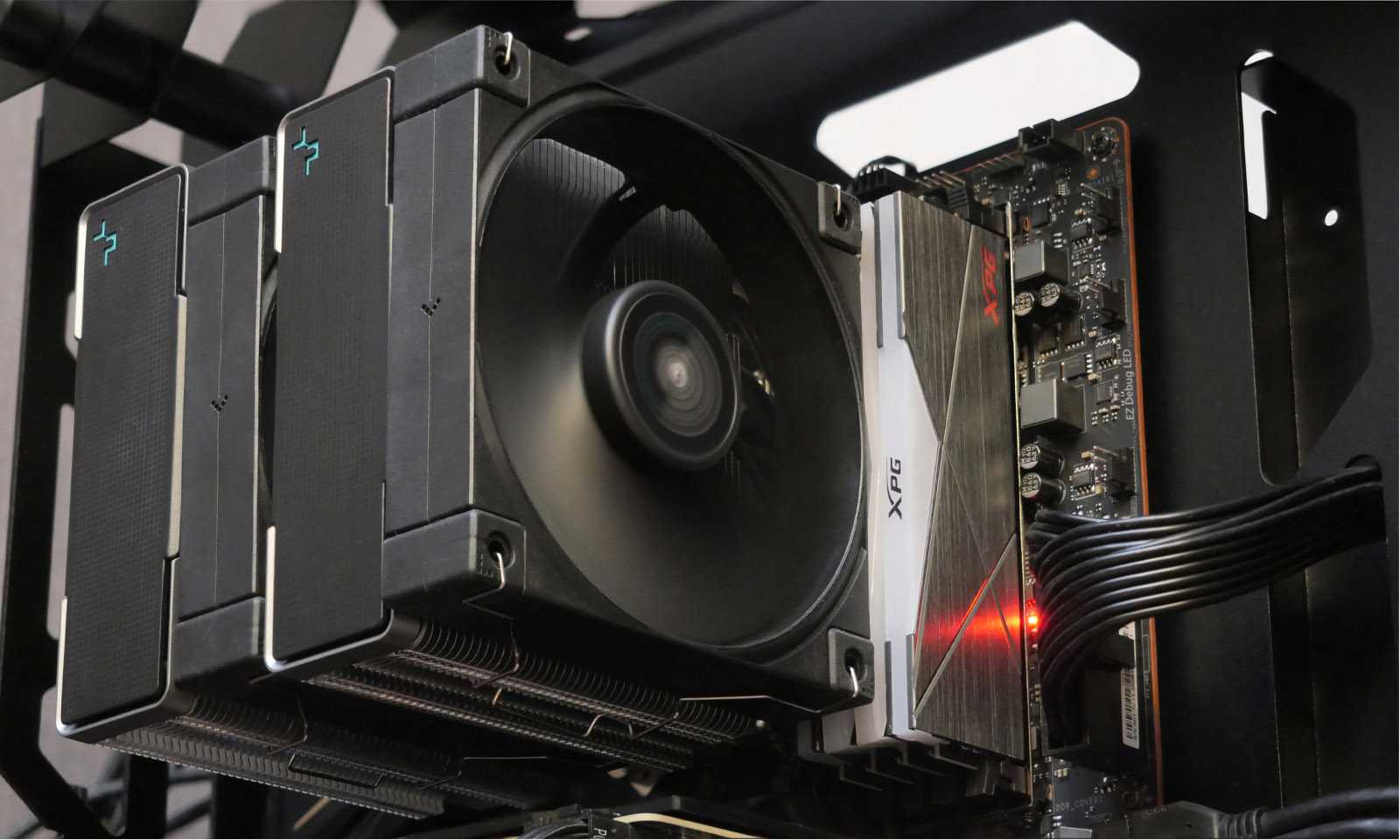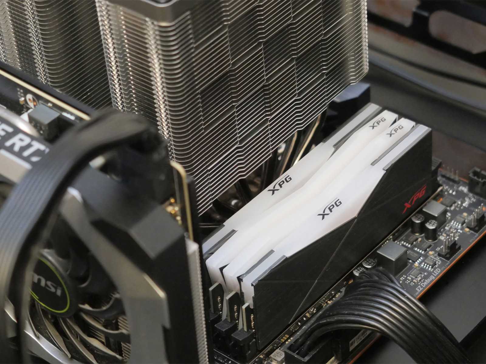 Но на тестовом стенде передний вентилятор всё же пришлось приподнять на несколько миллиметров вверх, иначе на материнской плате MSI MEG X570 ACE он низом упирался в радиаторы установленной оперативной памяти ADATA XPG Spectrix D и XPG Spectrix D60G с интегрированной подсветкой, высота которых 45 и 46 мм, соответственно.