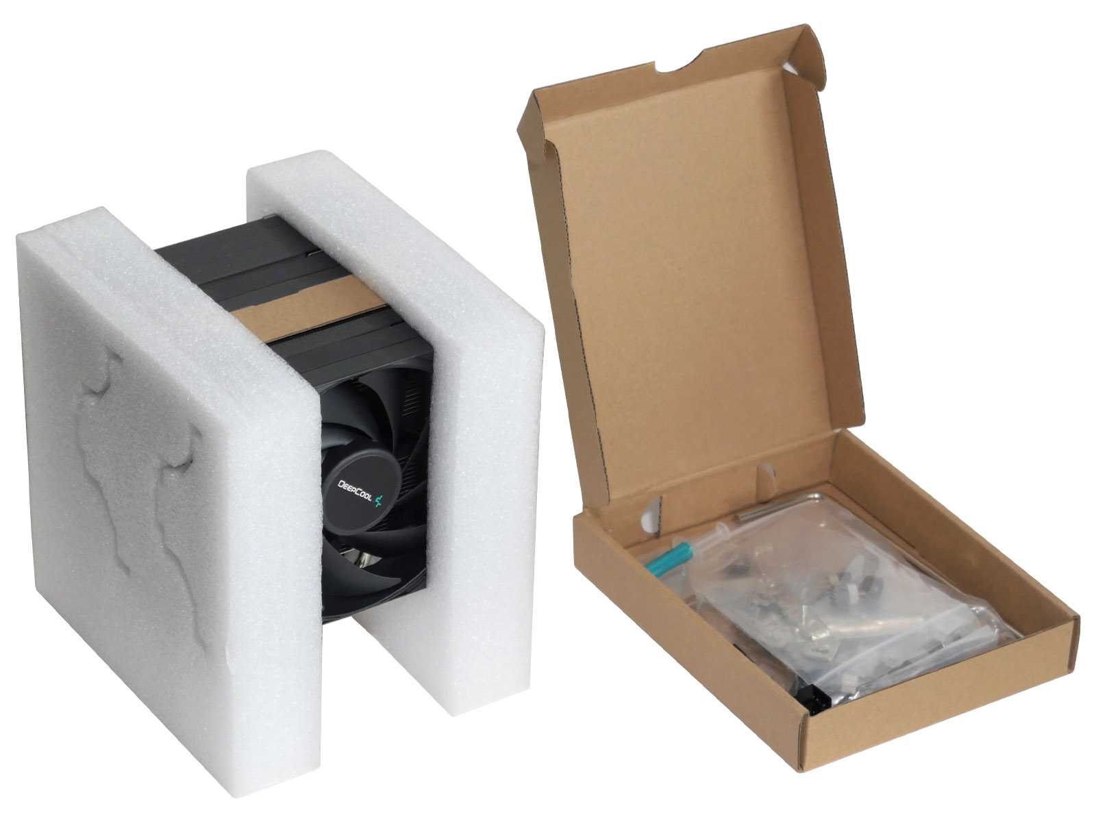 Обновлённые упаковки систем охлаждения от Deepcool выглядят свежо. За основу взята достаточно прочная картонная коробка, на которую надета декоративная белая обёртка с фотореалистичным изображением кулера и описанием его характеристик. Упаковка запаяна в прозрачный полиэтилен и имеет размеры 221 x 194 x 156 мм.