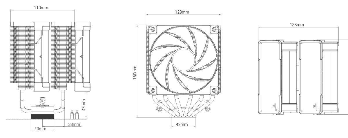С оглядкой на заявленную высокую производительность габариты можно назвать относительно небольшими для суперкулера: высота составляет всего 160 мм, а ширина с навешенными вентиляторами — 138 мм. Вес собранного кулера приличный — 1190 грамм.