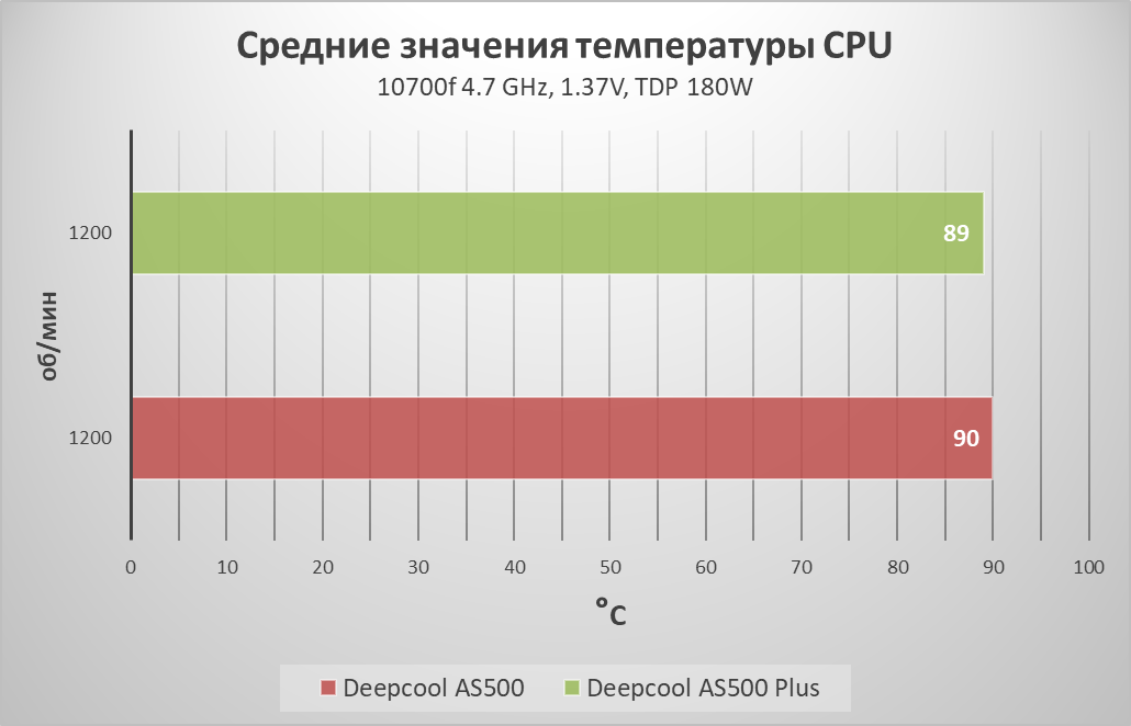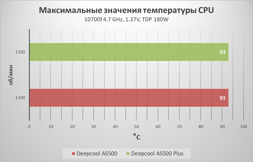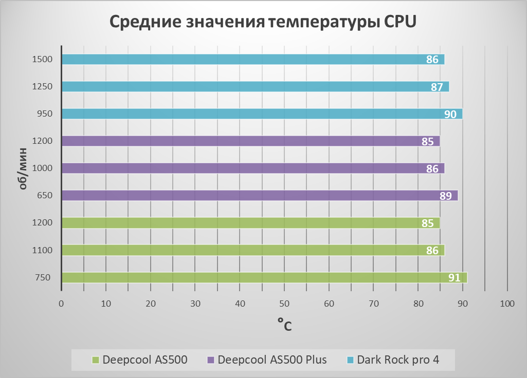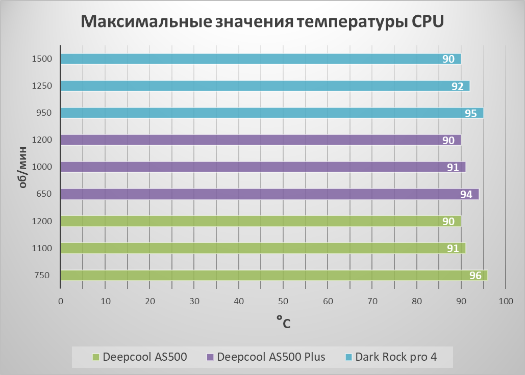 По результатам тестов видно, что все испытуемые справились с поставленной задачей на грани. При низких оборотах вентиляторов температуры доходили до 95 градусов.