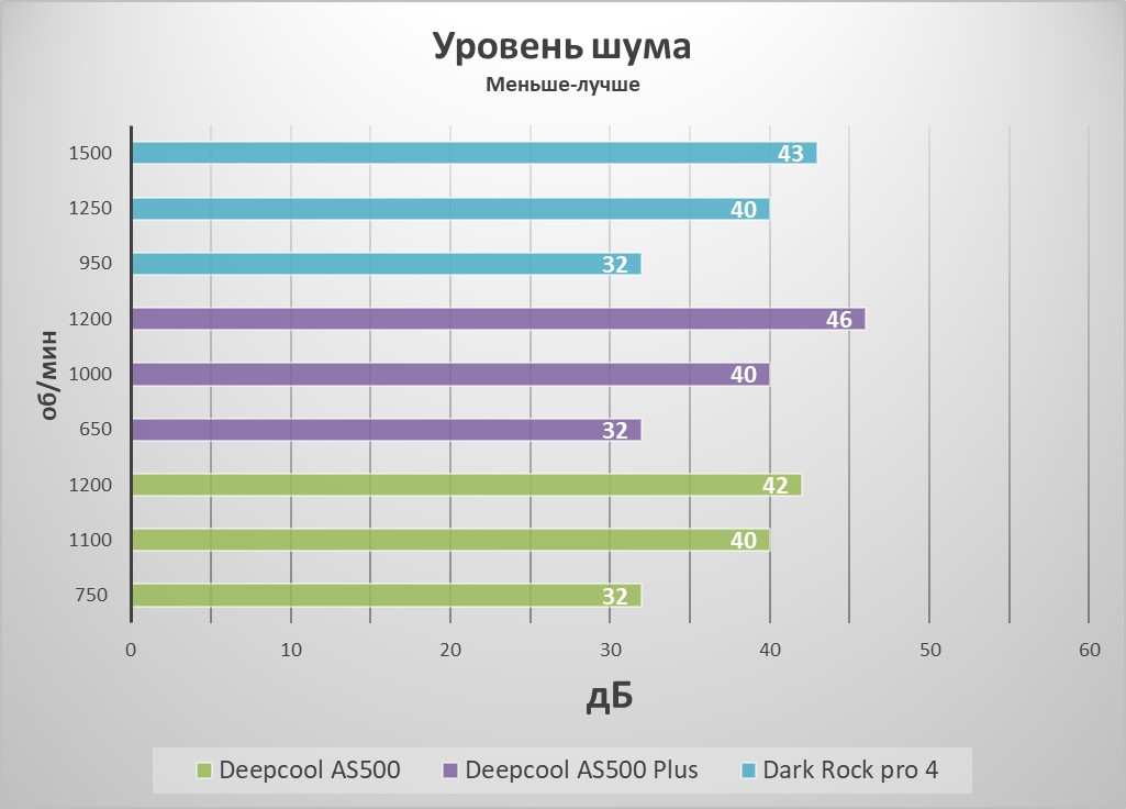 Шум измерялся в закрытом корпусе с расстояния в 30 см. Корпусные вентиляторы были остановлены. В ходе тестов было обнаружено, что задний вентилятор AS500 Plus издает неприятные завывания, ощутимые уже при 800 об/мин. При увеличении оборотов этот гул только усиливается, что делает использование данной системы охлаждения некомфортным. Связано это с тем, что задний вентилятор установлен вплотную к радиатору без зазора, о чем было рассказано выше.