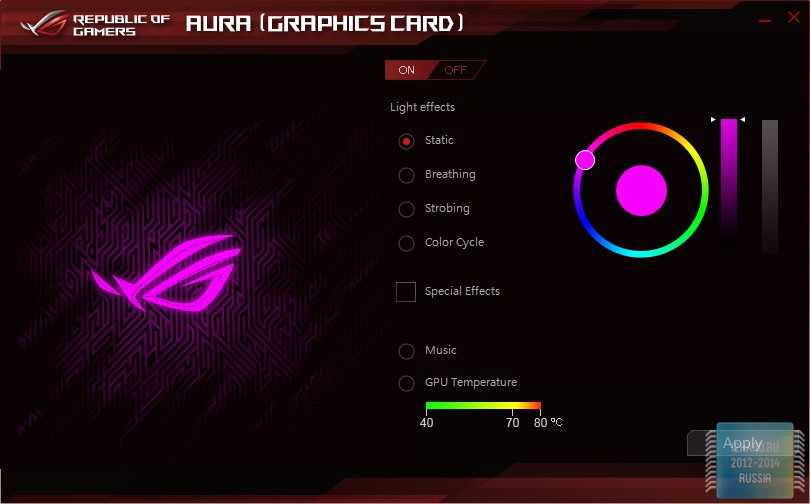 Остановимся и более подробно познакомимся с приложением AURA. Здесь можно задать любой цвет подсветки или вовсе её отключить. Для любителей динамики присутствуют всевозможные эффекты. Например, можно заставить подсветку работать в такт музыке. Отметим, что при изменении какого-либо параметра все данные сохраняются в памяти и при следующей загрузкене придётся по новой выставлять цвет подсветки или же держать в автозагрузке саму утилиту.