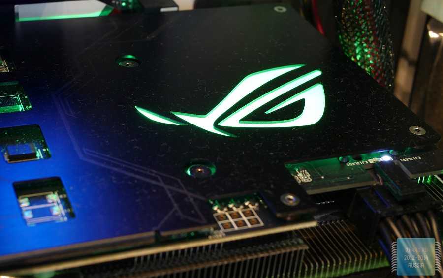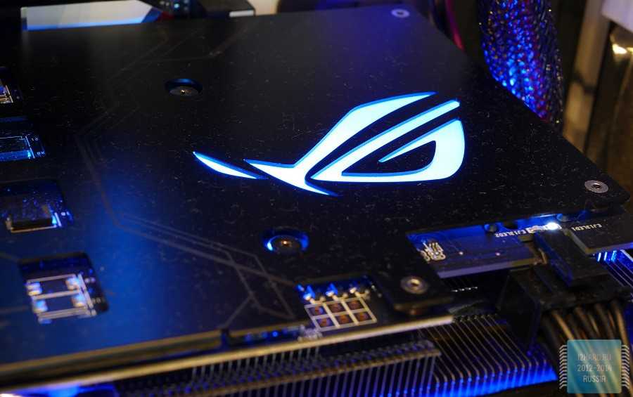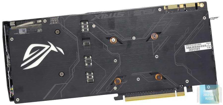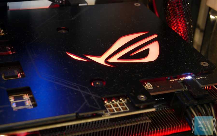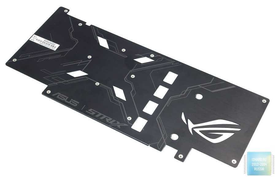 На другой стороне, как и положено, находится металлический кожух. Он, с одной стороны, не нарушает внешний вид игровой сборки, а с другой -защищает элементы, расположенные на печатной плате. Помимо этого, здесь размещен подсвечиваемый логотип Republic of Gamers. Также отметим, что на одном из шурупов стоит гарантийная пломба,при повреждении которой покупательлишаетсягарантийного обслуживания. Это весьма актуальный момент для тех, кто хочет установить водоблок для интеграции видеокарты в контур СВО.