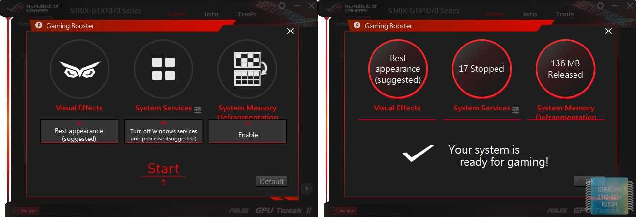 Из упрощенного меню доступен также Gaming Booster, благодаря которому можноотключить визуальные эффекты операционной системы, остановить лишние процессы и очистить системную память.