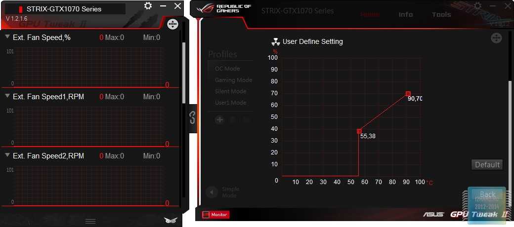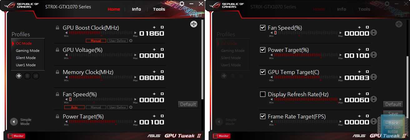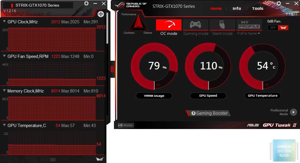GPU Tweak II условно поделён на две части. Слева отображается мониторинг всевозможных значений, а справа осуществляется выбор режима работы видеокарты. В нашем случае — OC mode/Gaming Mode/ Silent Mode.