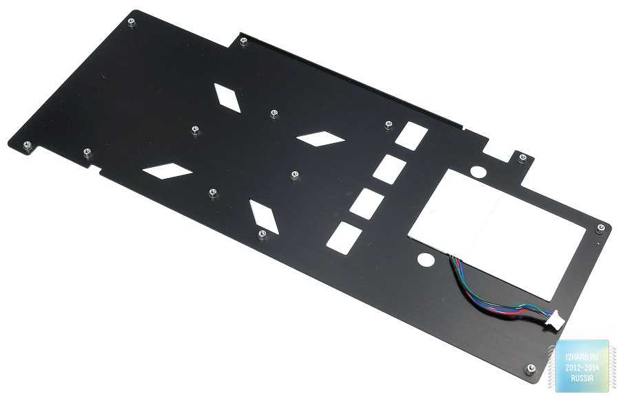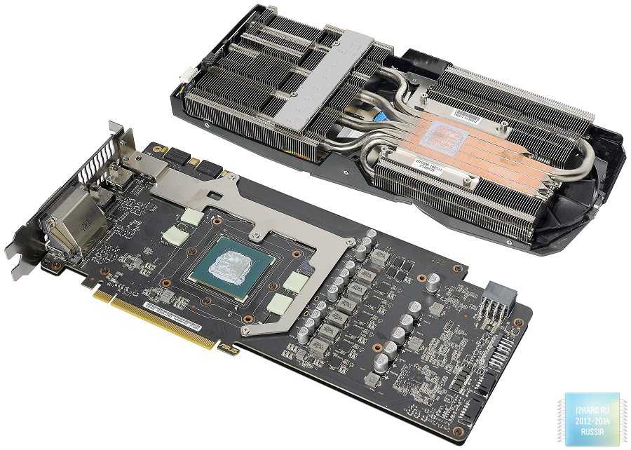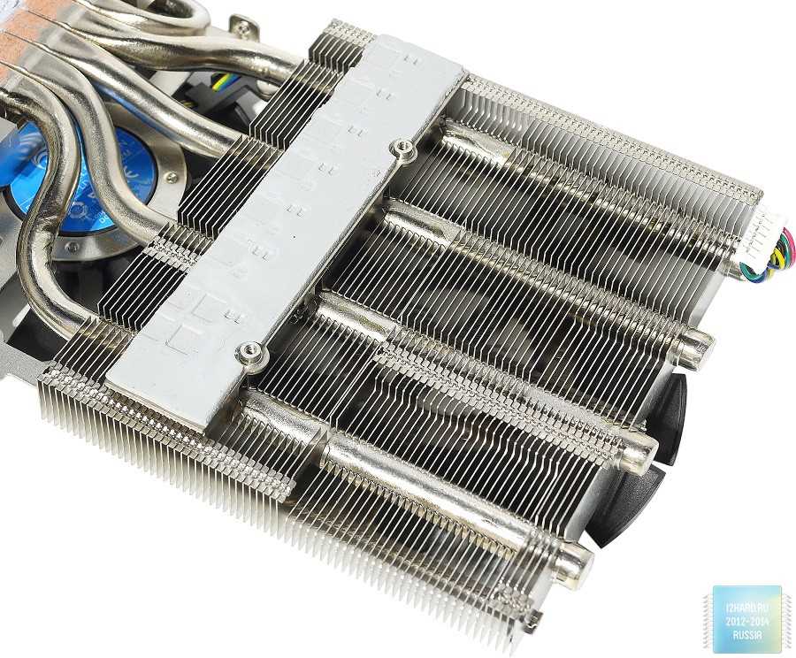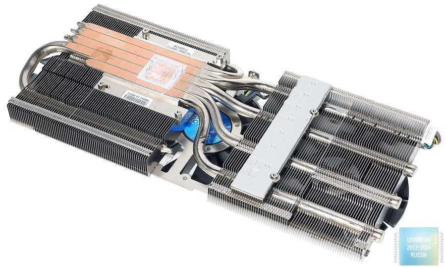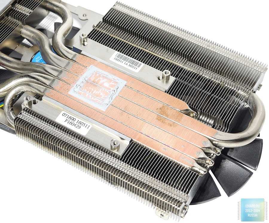Массивный никелированный радиатор состоит из двух секций и отводит тепло не только от графического процессора, но и от чипов памяти и подсистемы питания. В местах контакта предусмотрены теплопроводящие прокладки.
