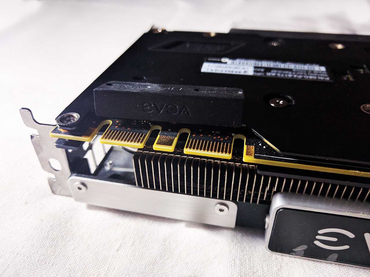 Чтобы объединить видеокарты в SLI придётся докупить новый фирменный мостик. Искомые разъемы располагаются в привычном месте. Для подключения дополнительного питания на радиаторе предусмотрено специальное углубление. Это помогает сэкономить немного места, ведь коннектор уже не будет выпирать и не помешает закрыть боковую крышку в компактном корпусе. Кстати о питании. Чтобы устройство исправно работало, потребуется качественный блок мощностью от 500 Вт или выше.