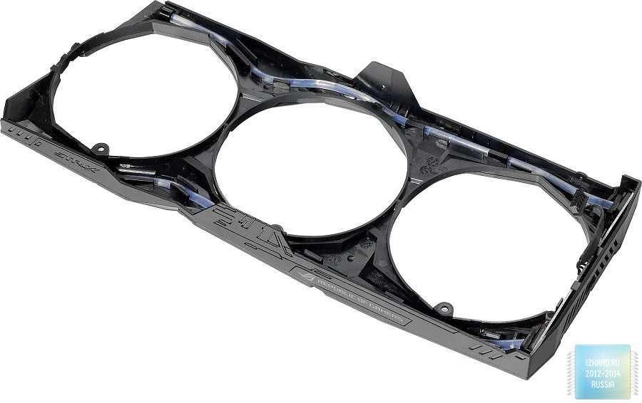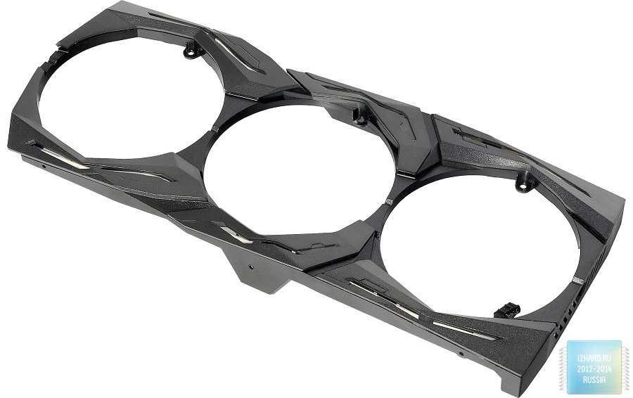 При оформлении лицевой стороны было решено отказаться от металлического кожуха. Видимо, это позволило облегчить конструкцию и снизить стоимость. Несмотря на это, видеокарта выглядит ярко и интересно. Три больших вентилятора придают некоторую массивность данной конструкции. Прорези на кожухе сделаны не просто так -за ними расположены прозрачные трубки с RGB подсветкой.