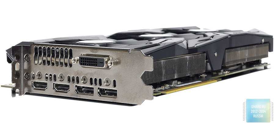 В сравнении с референсной моделью здесь наблюдаетсяналичие дополнительного порта HDMI и отсутствие одного разъема DisplayPort. В итоге интерфейсная панель выглядит следующим образом: 2х HDMI, 2х DisplayPort, DVI-D.