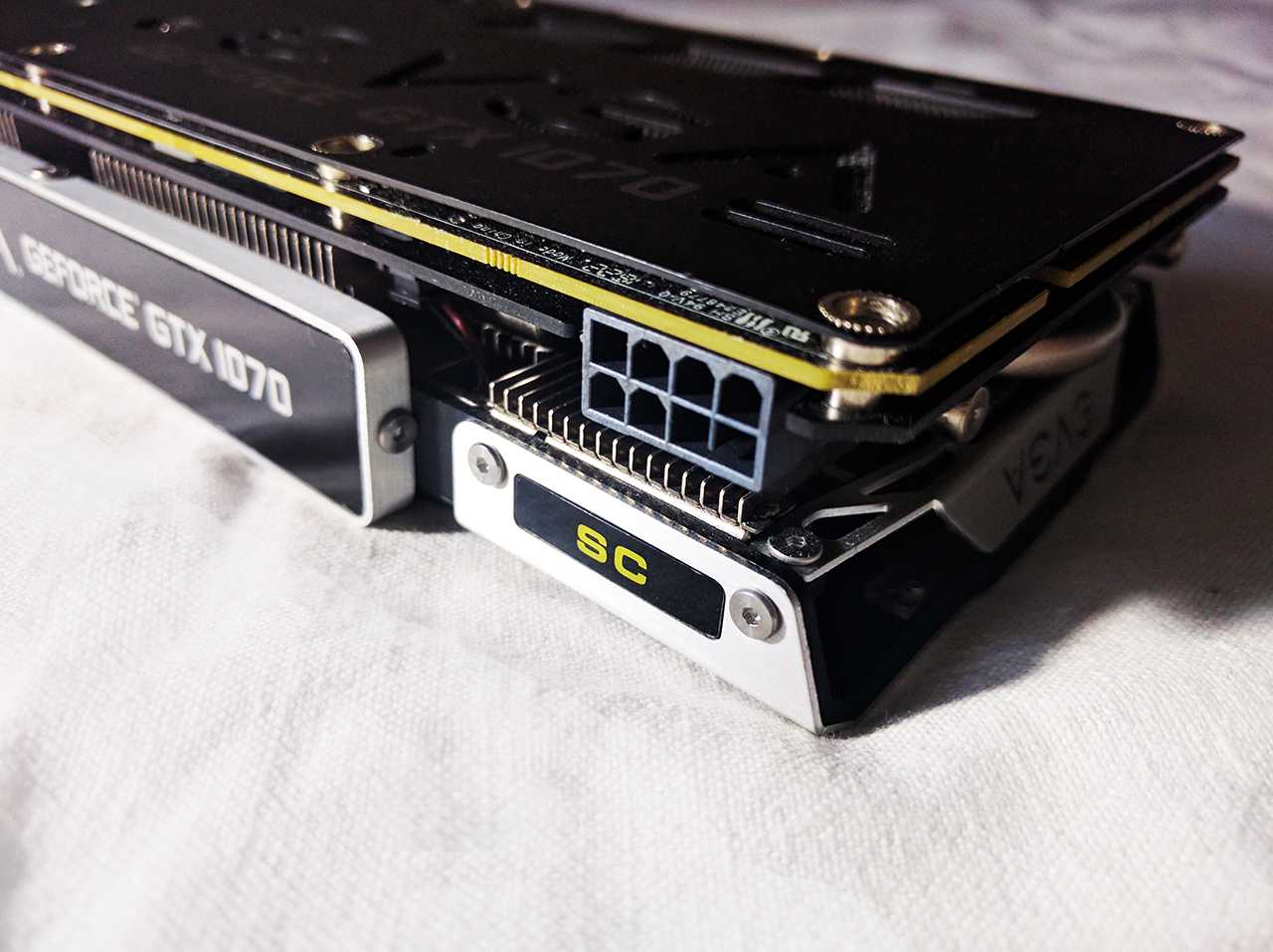 У версии EVGA 1070 SuperClocked всего один 8-пиновый разъем питания. И этого вполне хватает для работы, даже при неплохом разгоне. Более мощная версия с усиленной системой питания, модель FTW, работает от двух 8-пиновых разъемов.