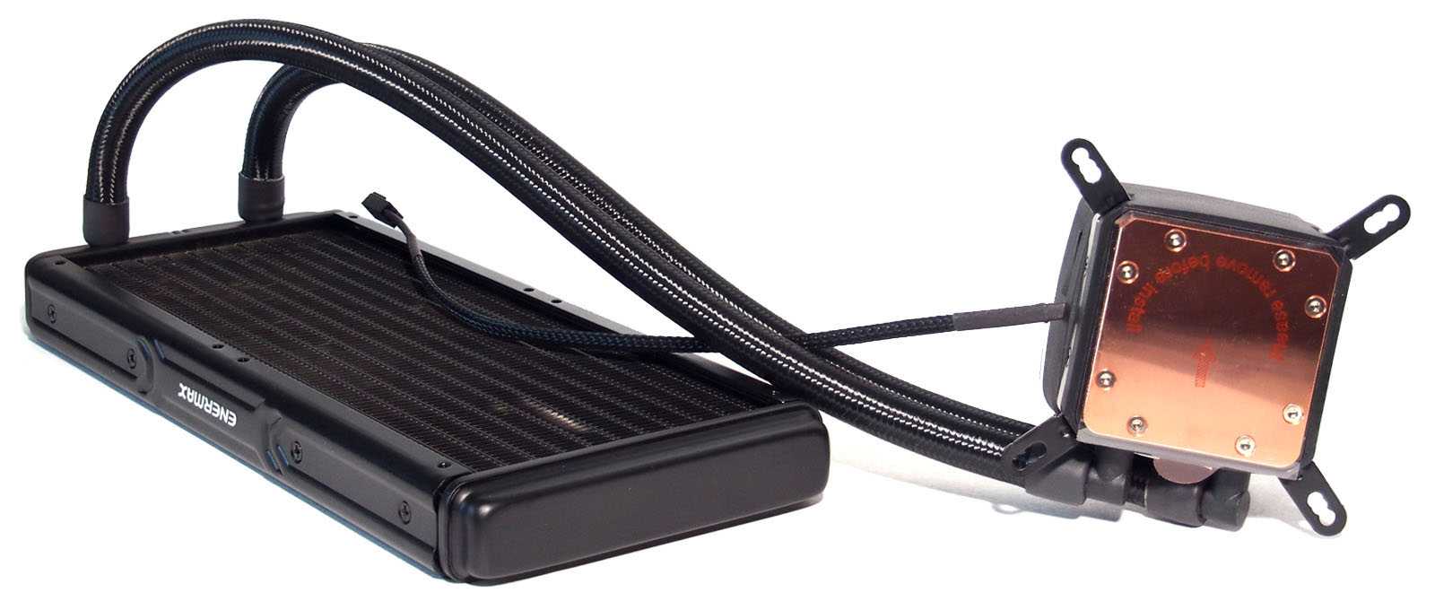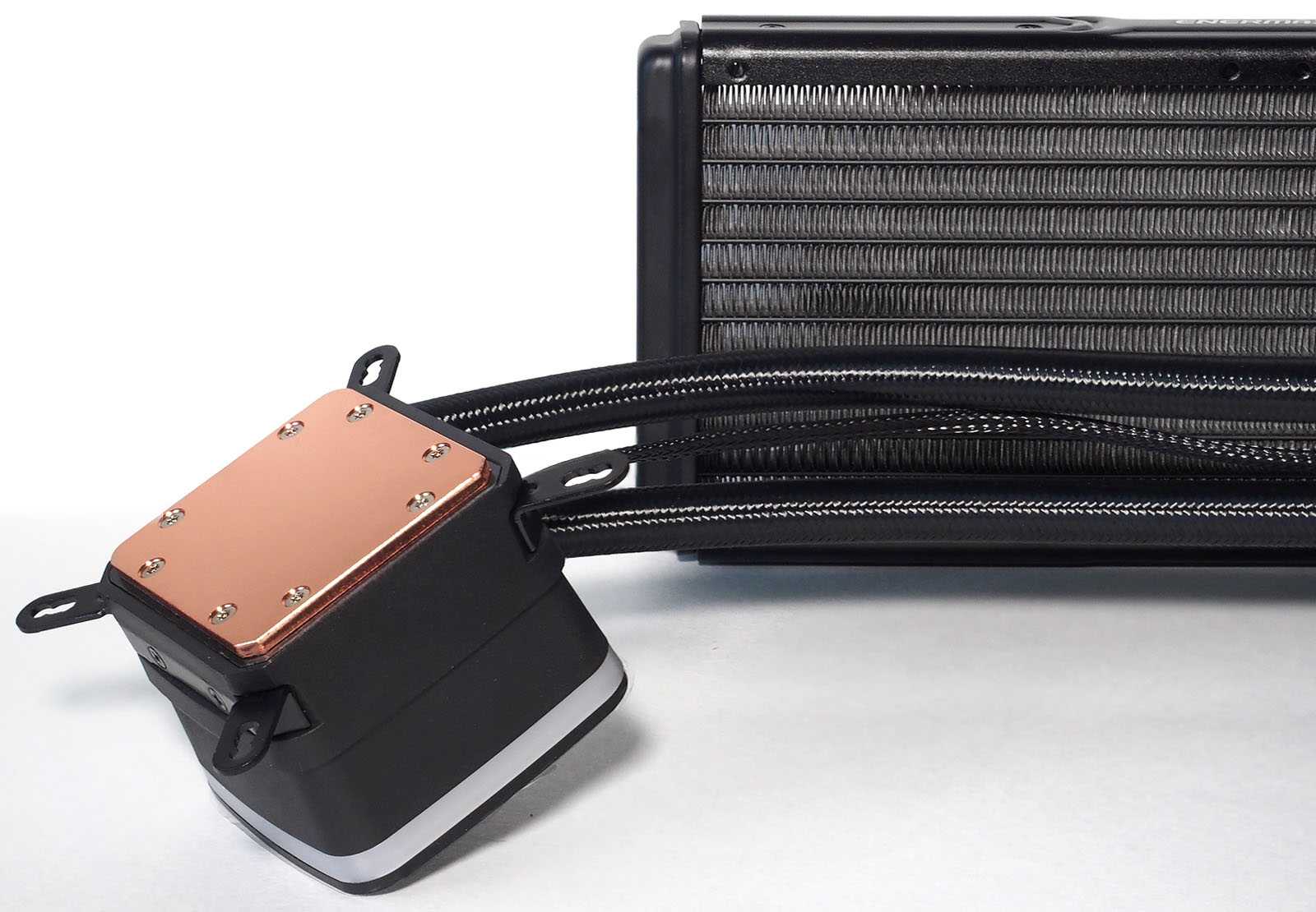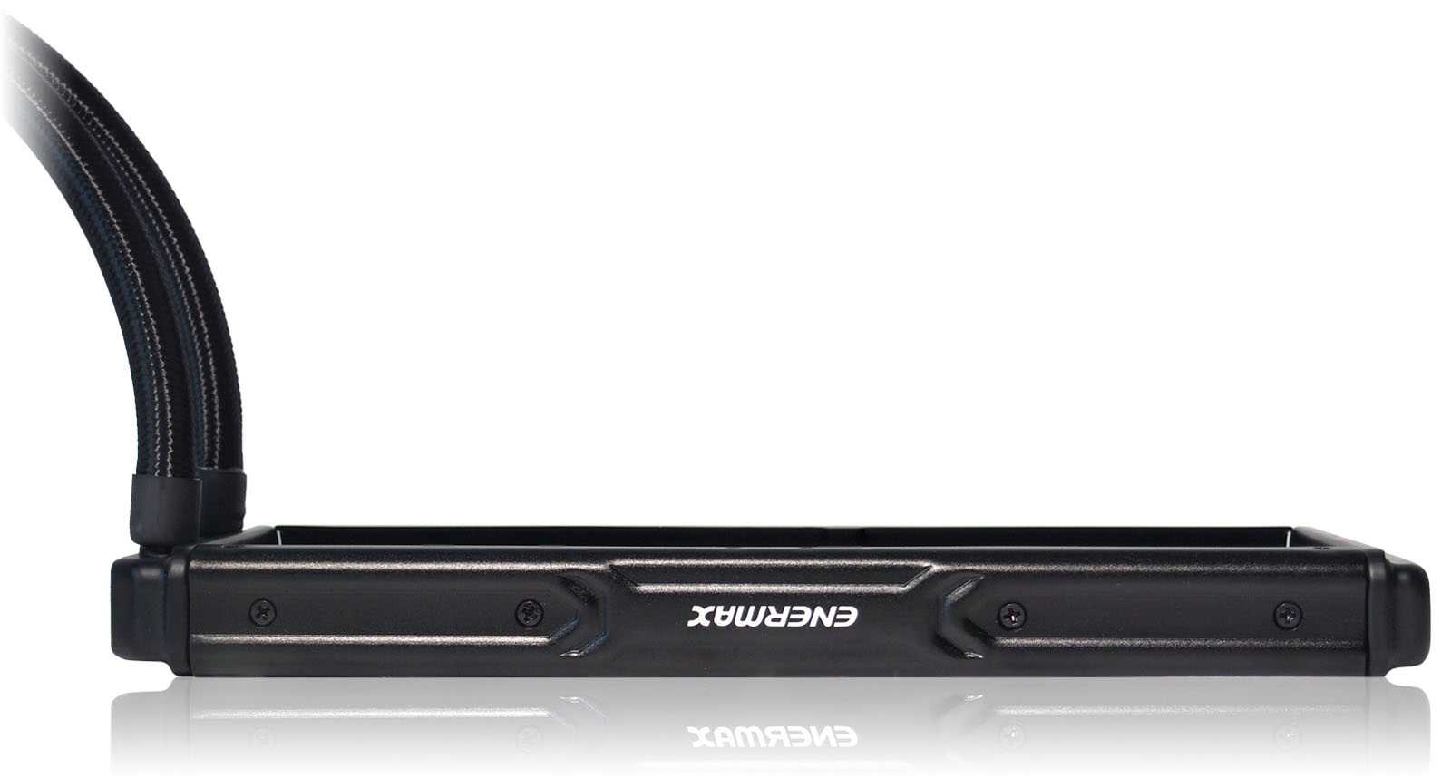 Радиатор соединён с водоблоком двумя гибкими армированными шлангами в защитной нейлоновой оплётке черного цвета. Их длина — 40 см, чего достаточно даже для крупных представителей семейства Middle-tower. В качестве теплосъемника в основании водоблока прикручена квадратная медная пластина 56 x 56 мм толщиной 3 мм. Входной поток жидкости с одного из фитингов направлен в центральную часть пластины, наиболее разогревающуюся во время работы. Также, позаявлению Enermax, c внутренней стороны у пластины имеется дополнительная микроканальная структура, организованная по технологии Shunt-Channel (SCT), для повышения эффективностиотведениятепла циркулирующей жидкостью. Снаружи пластина ровная и отшлифованная до матового состояния.