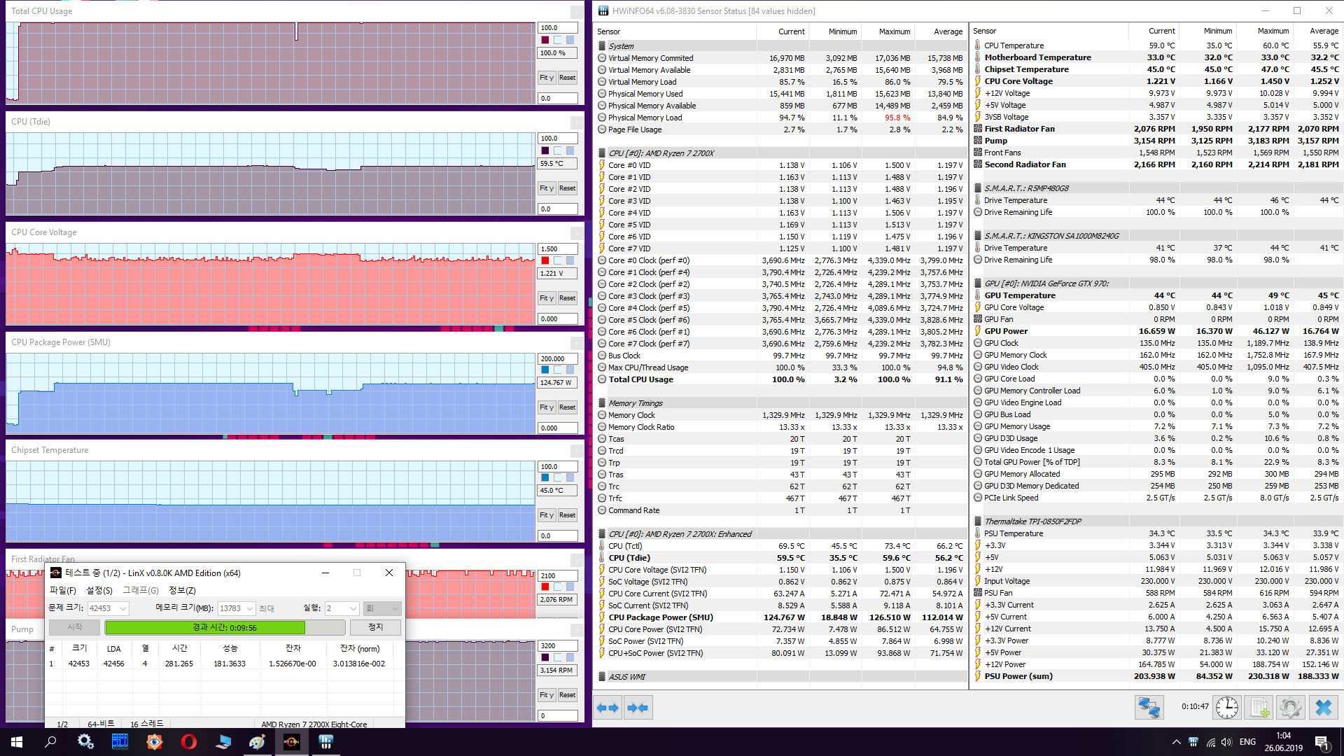 Как и в случае с ранее протестированными на этом же стенде системами охлаждения, для оценки температуры центрального процессора при высокой нагрузке использовалась утилита LinX 0.8.0K AMD Edition. На скриншоте ниже показан пример замера с включенными на полную мощность вентиляторами и помпой системы жидкостного охлаждения.