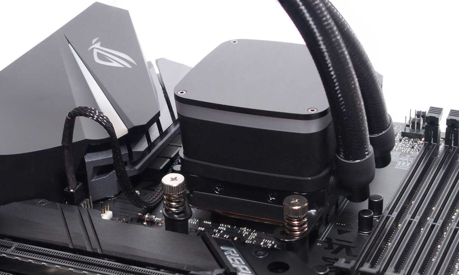 После нанесения термопасты на крышку процессора, на получившуюся конструкцию устанавливается водоблок, прикручиваемый четырьмя подпружиненными винтами с накатанной головкой и шлицем под крестовую отвёртку.
