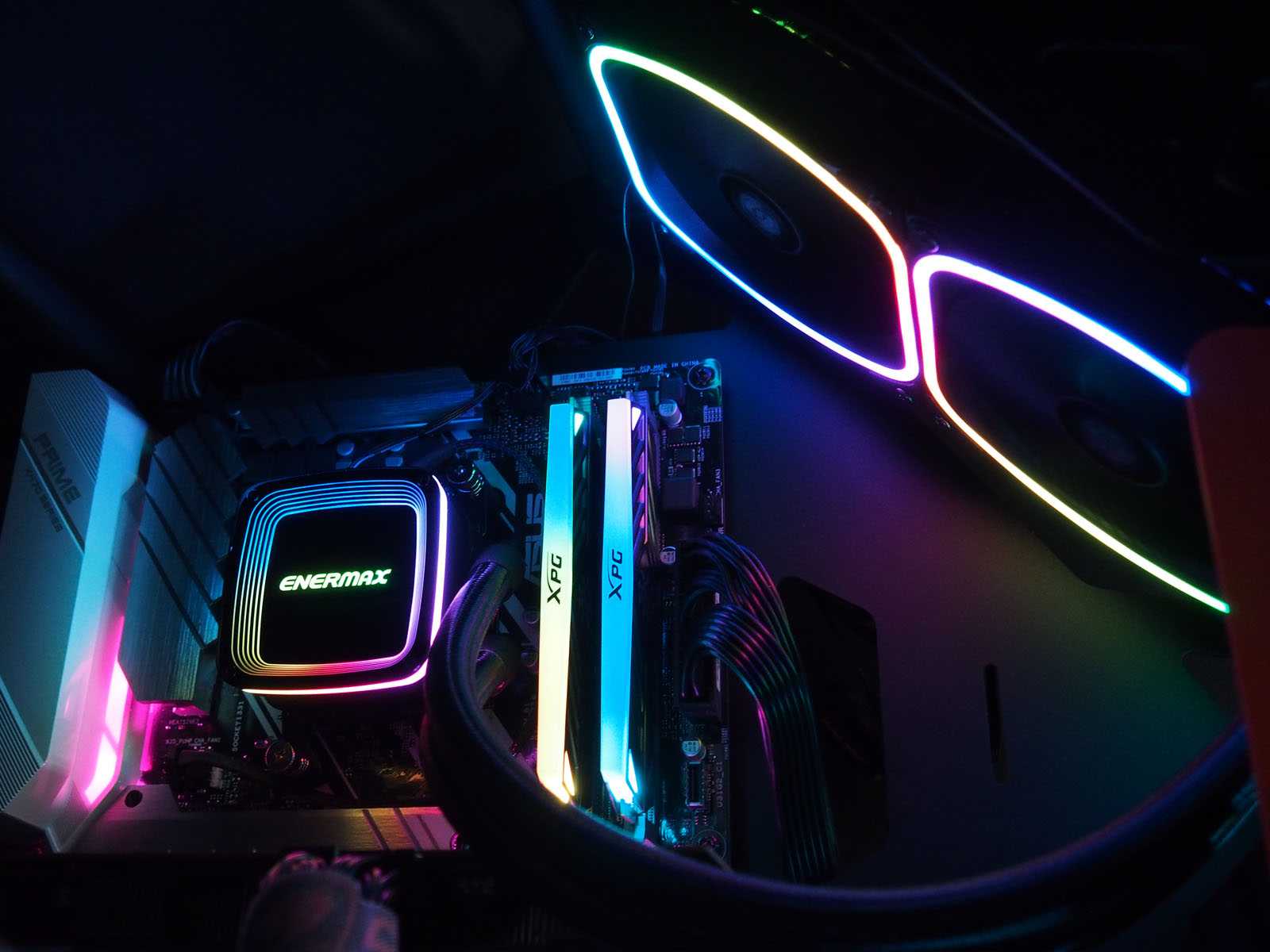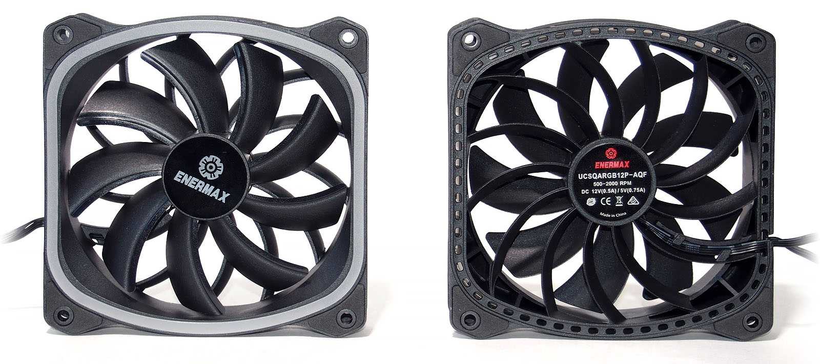 Комплектные вентиляторы Enermax UCSQARGB12P-AQF — весьма производительные экземпляры со скоростью вращения крыльчатки от 500 до 2000 оборотов в минуту. Они создают воздушный поток до 79,8 CFM и воздушное давление до 3.6 мм H2O. На практике вентиляторы стабильно работают при скорости от 350 оборотов и выше.