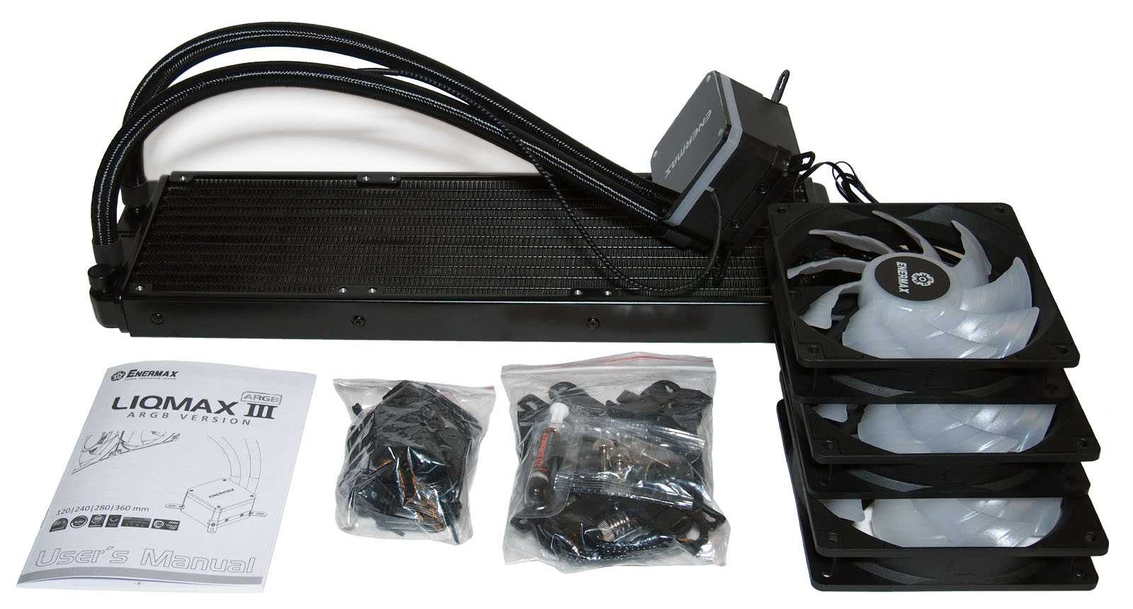 Комплектация немного изменилась по сравнению с рассмотренной ранее Liqmax III RGB 120, в основном за счёт перехода на адресные светодиоды.