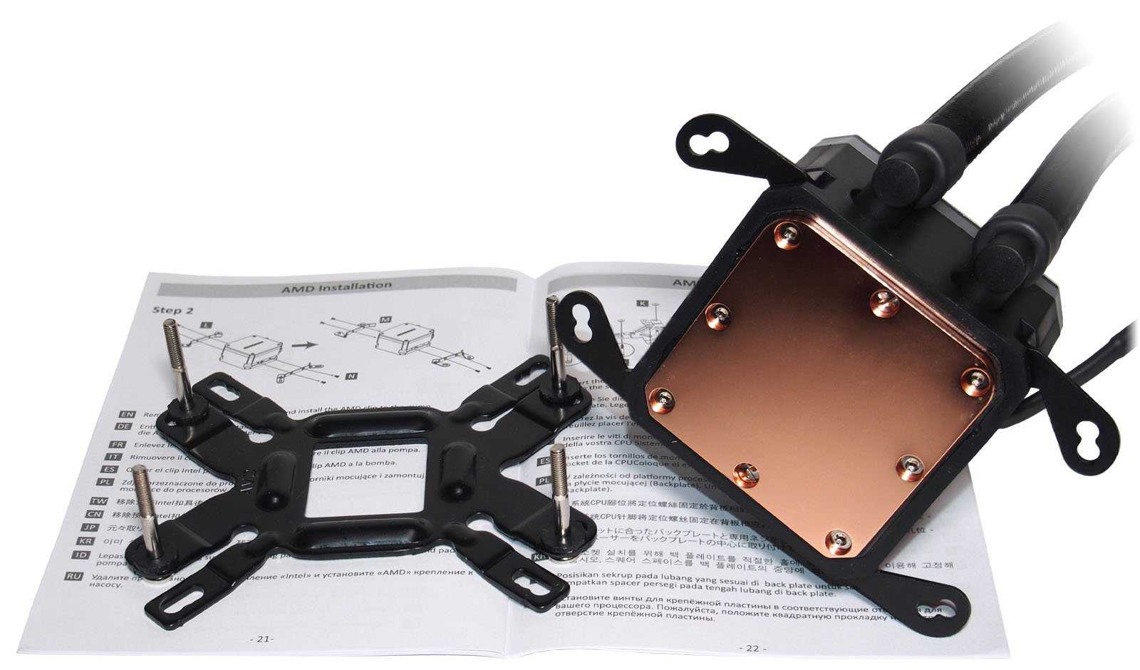 Процесс установки системы охлаждения на все совместимые типы сокетов процессоров Intel и AMD проиллюстрирован в небольшом буклете с пользовательской инструкцией. В том числе описан и процесс подключения подсветки для синхронизации с другими устройствами. Каждый шаг имеет описание на нескольких языках, включая русский.