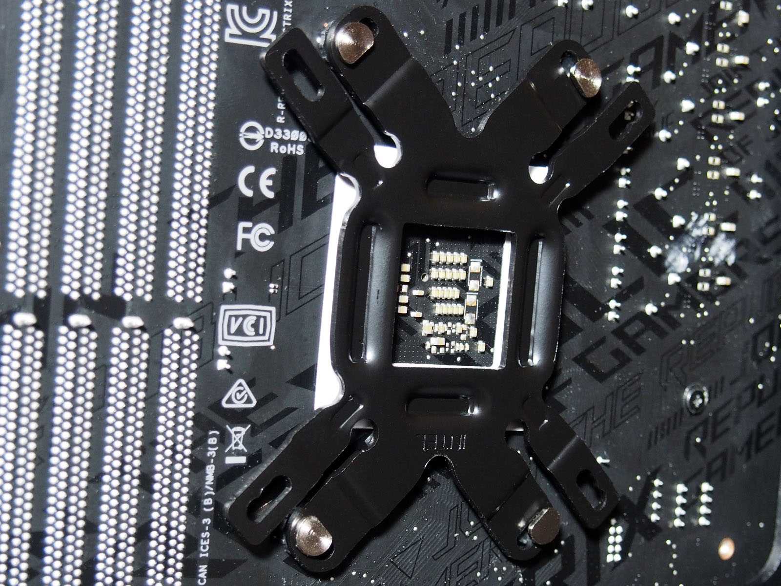 Штатный бэкплейт материнской платы также меняется на универсальный из комплекта Liqmax III RGB 120. Фиксация удлиненных винтов в отверстиях на пластиковые шайбы весьма удобна, процесс сборки занимает меньше времени, чем с винтовыми проставками.