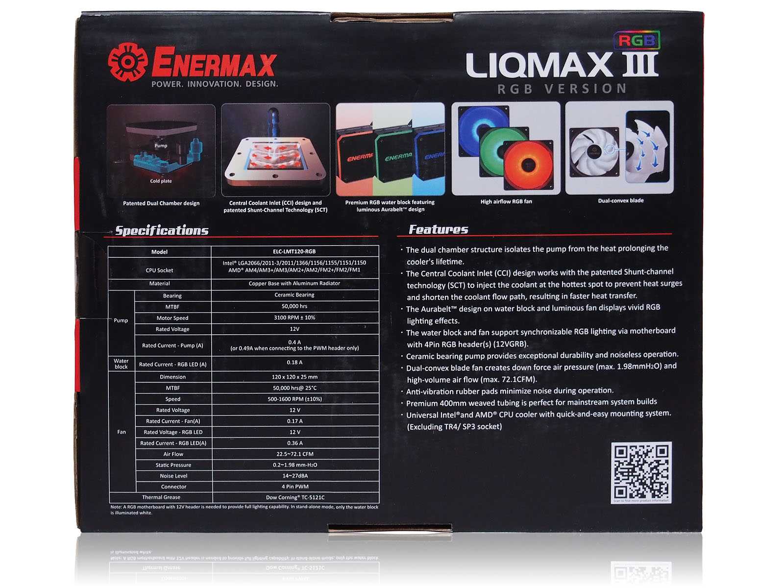 С обратной стороны коробки на английском языке перечислены основные преимущества серии Liqmax III и приведена подробная таблица со спецификацией. На одной из боковых граней также нанесены схематичные изображения с габаритами отдельных компонентов.