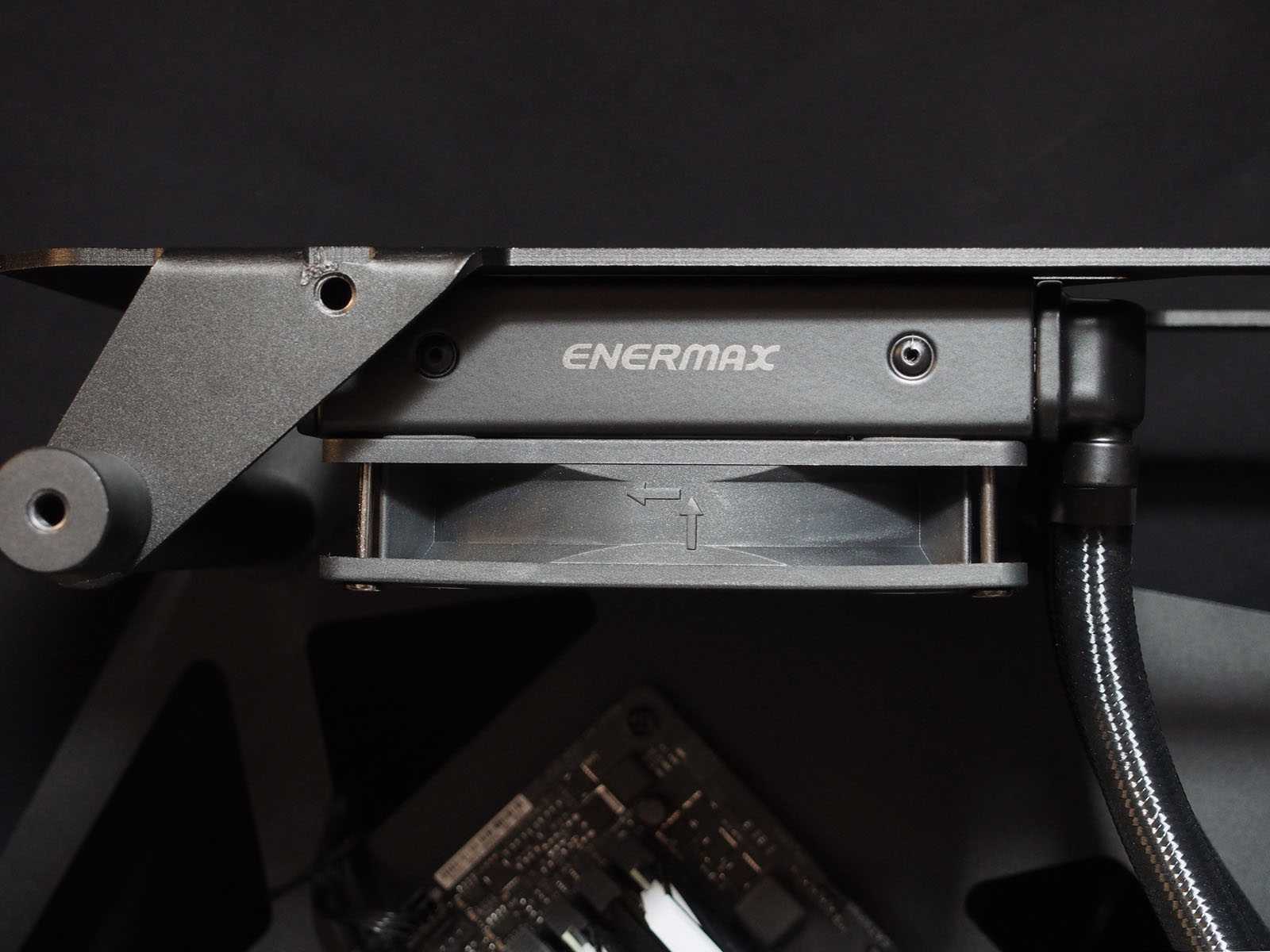 Фиксированное положение подсвечиваемой надписи Enermax на водоблоке намекает на желательное расположение фитингами вправо. Учитывая, что они поворотные, а сами шланги достаточно длинные в большинстве конфигураций удастся разместить водоблок правильно без усилий. Подключение помпы возможно как напрямую в один из разъемов материнской платы для вентиляторов, так и с использованием комплектного адаптера к штекеру SATA блока питания. Первый вариант предпочтительнее, так как позволяет регулировать скорость, а соответственно и шум во время работы.