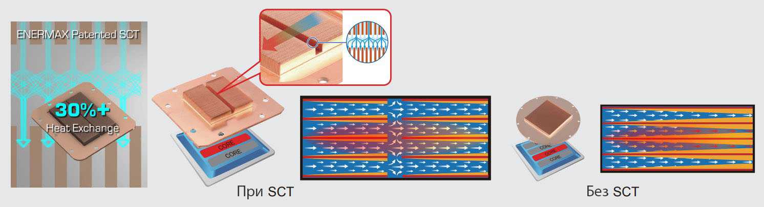 Как уже было упомянуто, используется дополнительная двухсекционная микроканальная структура Shunt-Channel (SCT), запатентованная Enermax. Если кратко, то в ней смешиваются потоки жидкости для лучшего выравнивания температуры циркулирующего теплоносителя, за счет чего получается выигрыш до 30 процентов по эффективности теплоотведения. Кроме того входной поток охлажденной жидкости с одного из шлангов направлен в центральную часть микроканальной части пластины, наиболее разогревающуюся от процессора во время работы.