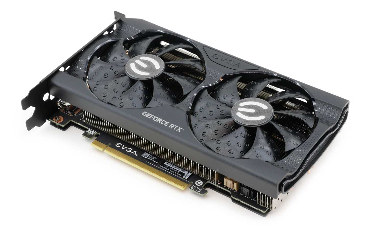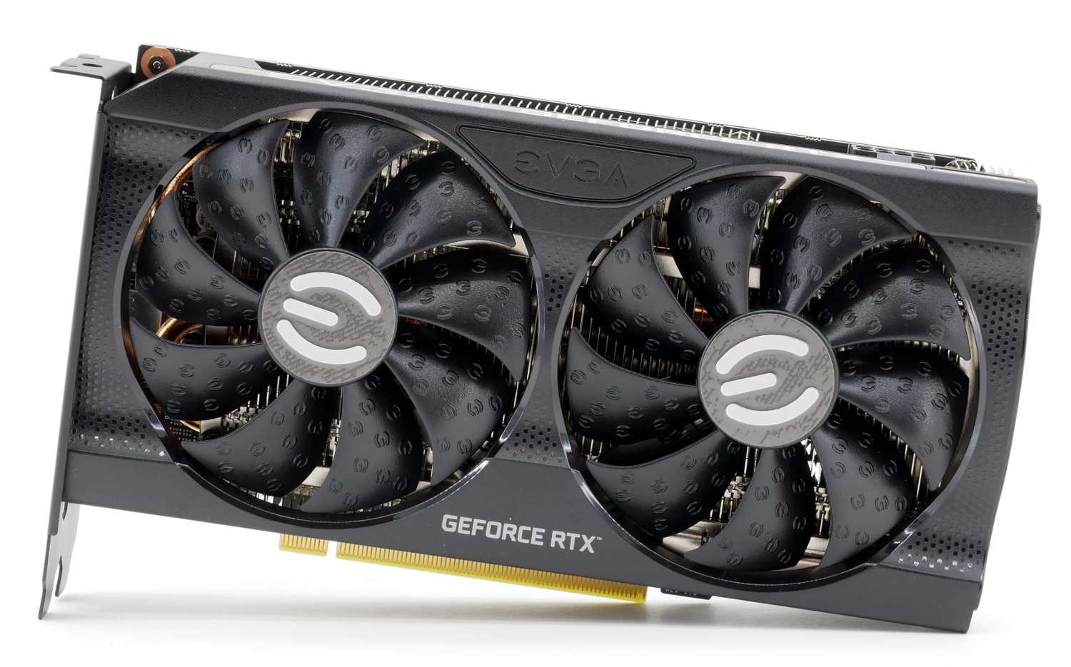 EVGA GeForce RTX 3060 Ti XC Gaming получилась очень компактной и при длине корпуса 202 мм едва перекрывает два слота расширения. Лицевую часть украшают два вентилятора типоразмера 92 мм с фирменными насечками. И посмотрите: производитель использует вертушки, дующие по часовой стрелке, когда обычные модели работают иначе, в противоположную сторону.