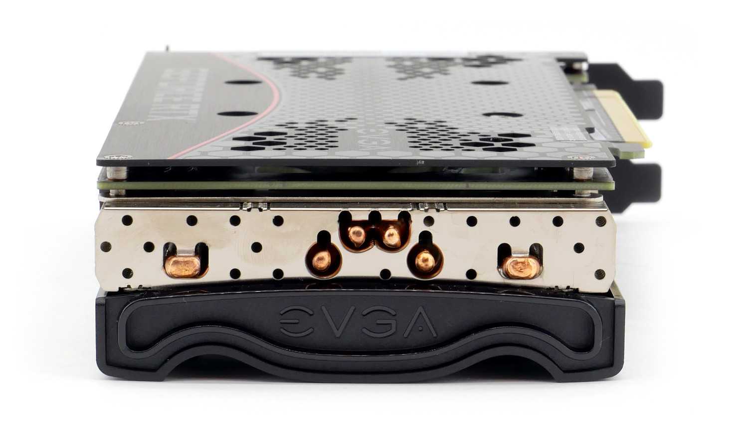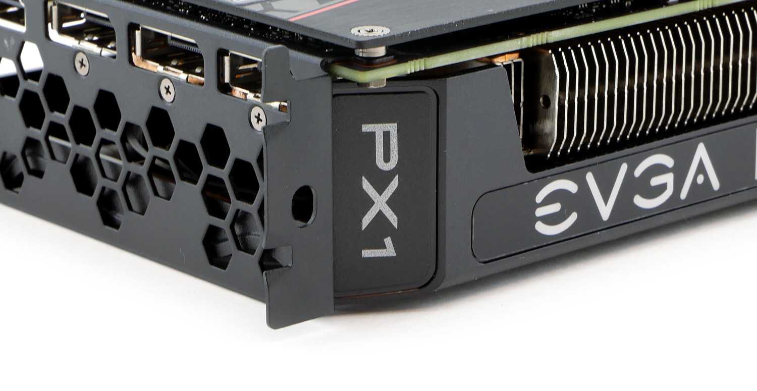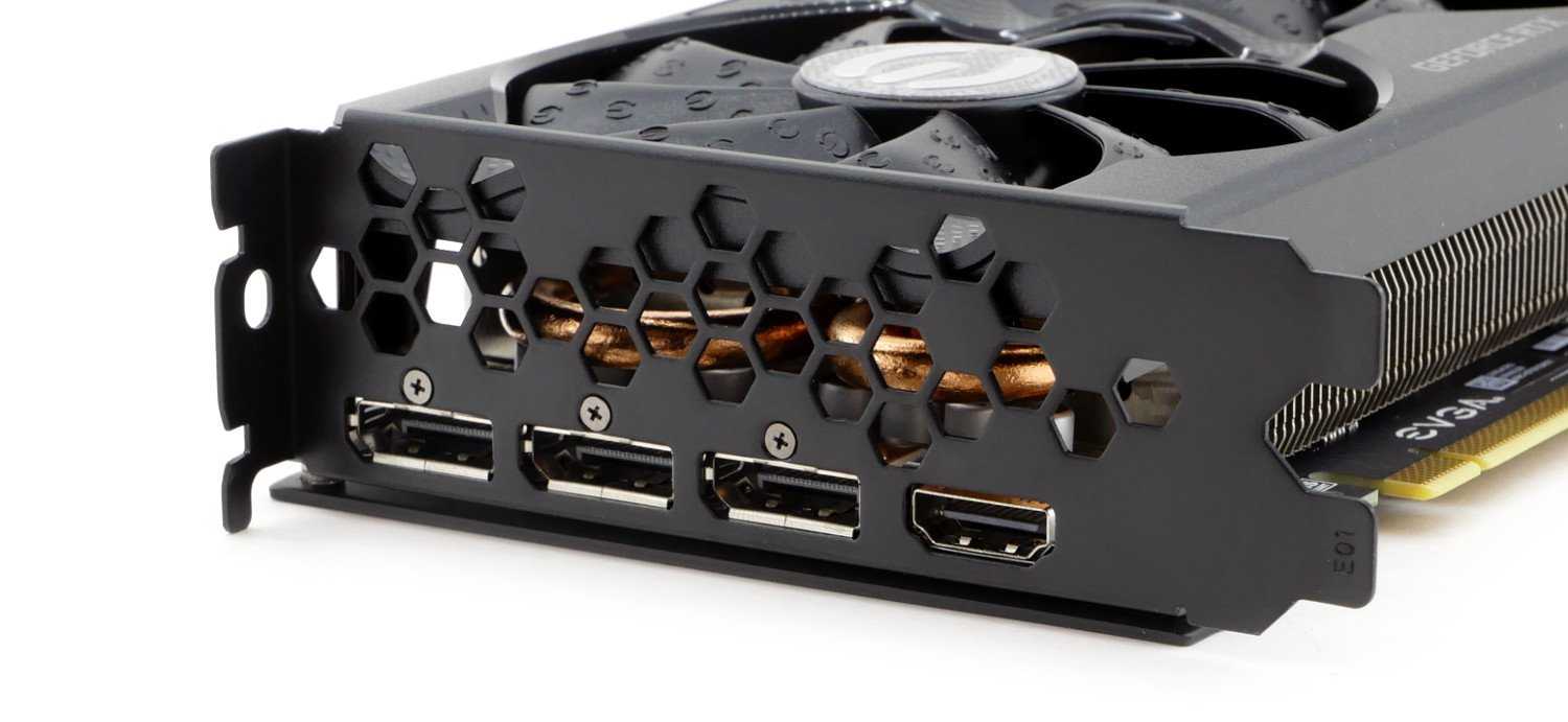 И, конечно, разработчики из EVGA не могли остаться равнодушными к интерфейсной панели, покрасив планку в матовый черный цвет, чтобы она не выбивалась из общего дизайна. Используется стандартный набор интерфейсов — HDMI и трио DisplayPort.