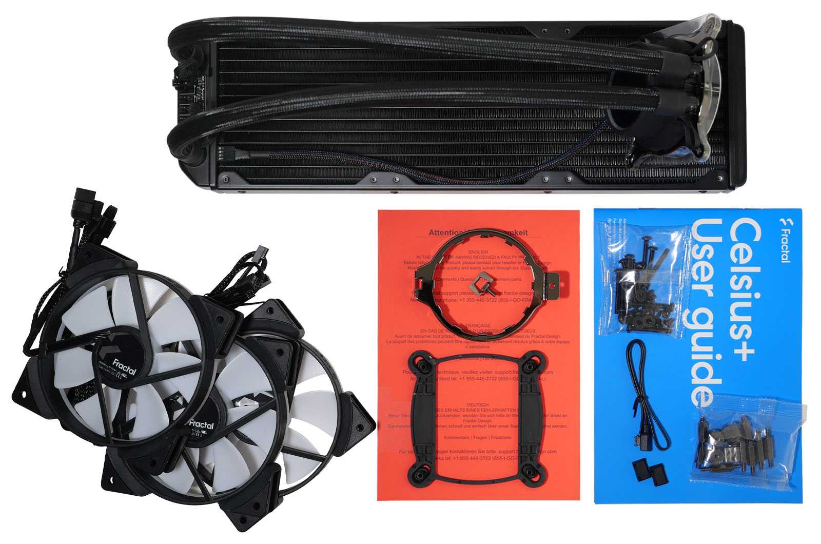 In the box, you’ll find the Lumen S24 RGB Cooler, a user manual, and one brochure. The latter gives you instructions on how to reach the manufacturer in case you receive a faulty cooler.