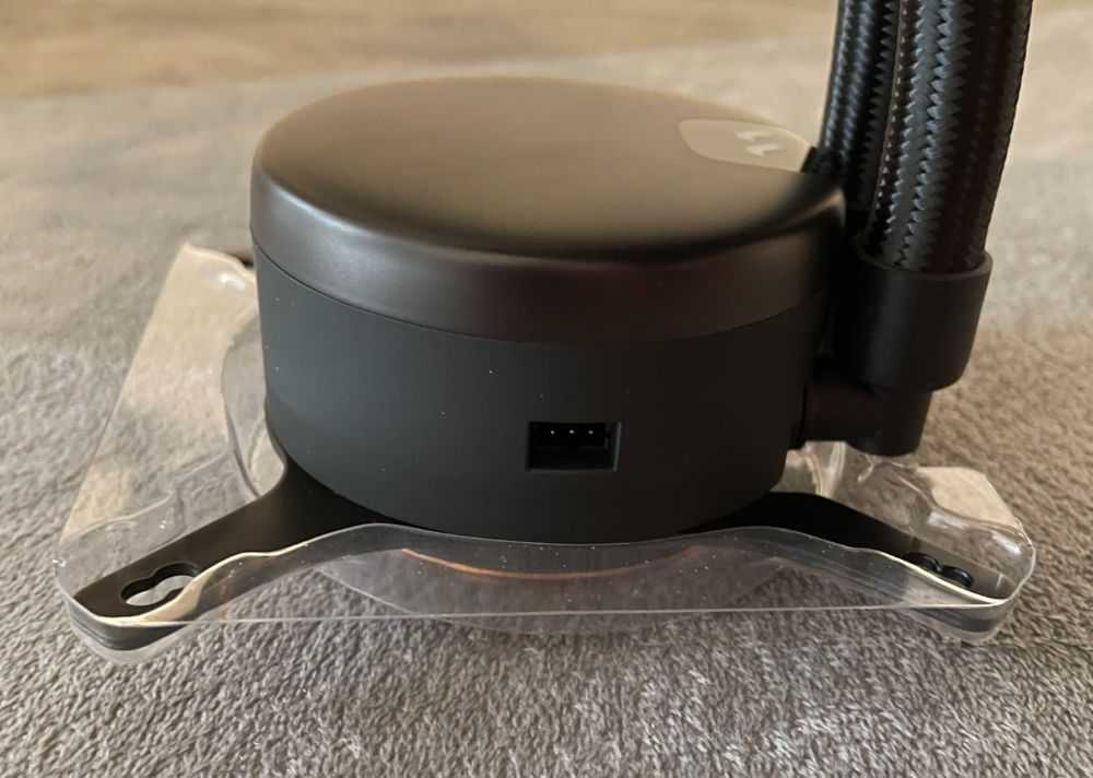 Getting down to its level and looking around, we noticed a small 3-pin header tucked into the side of the head unit. Keep in mind; there is no pump in this head unit, which makes this set of pins needed for ARGB control of the lighting within.