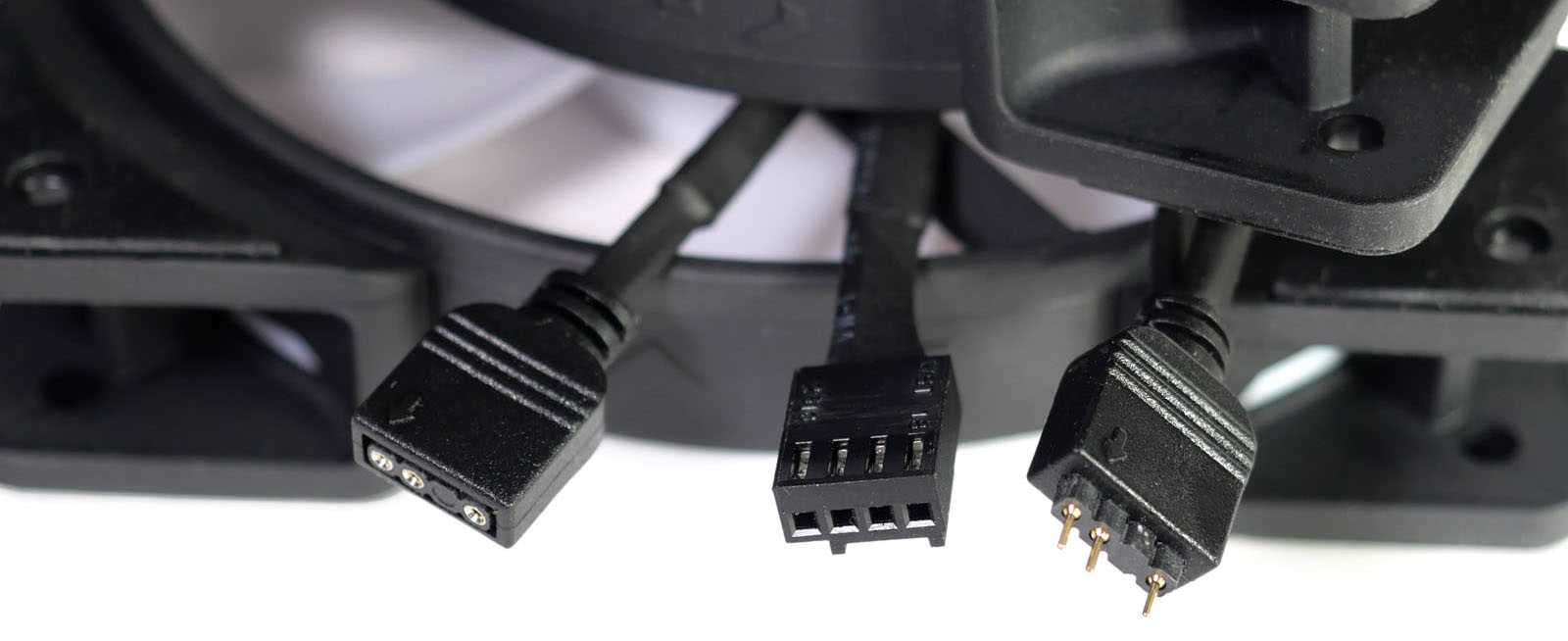 От каждого вентилятора выведено по два провода: один длиной 35 см — питание мотора и второй длиной 30 см — питание и управление подсветкой с ответвлением 18 см для продолжения цепочки подключения.