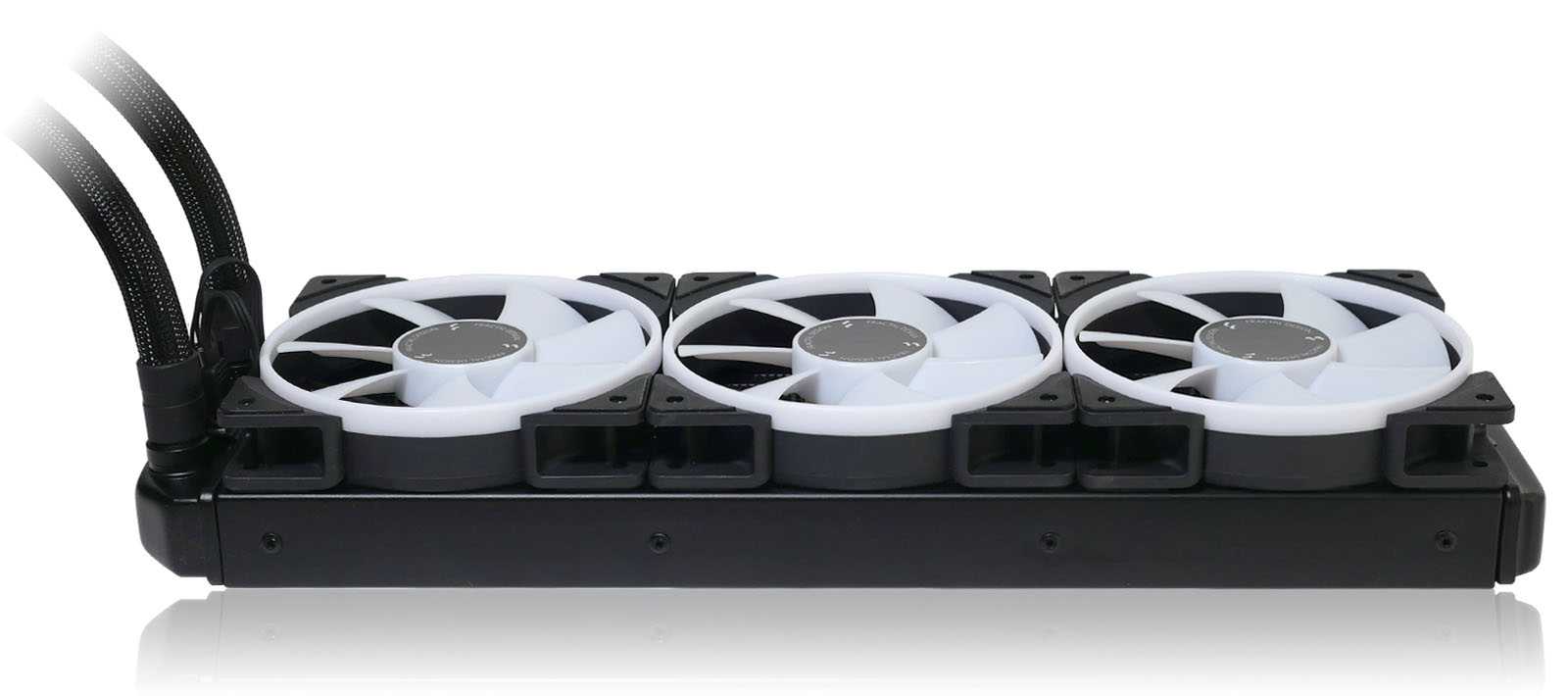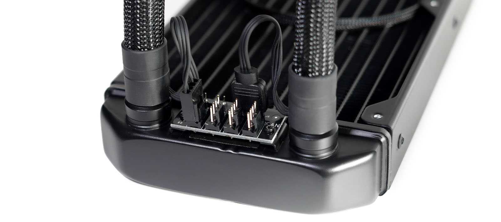 The Lumen S24 RGBuses low-permeability rubber tubes and braided nylon sleeves. Also, the cooler has articulating elbow fittings for easier tube routing and reduced tension on the cold plate housing.
