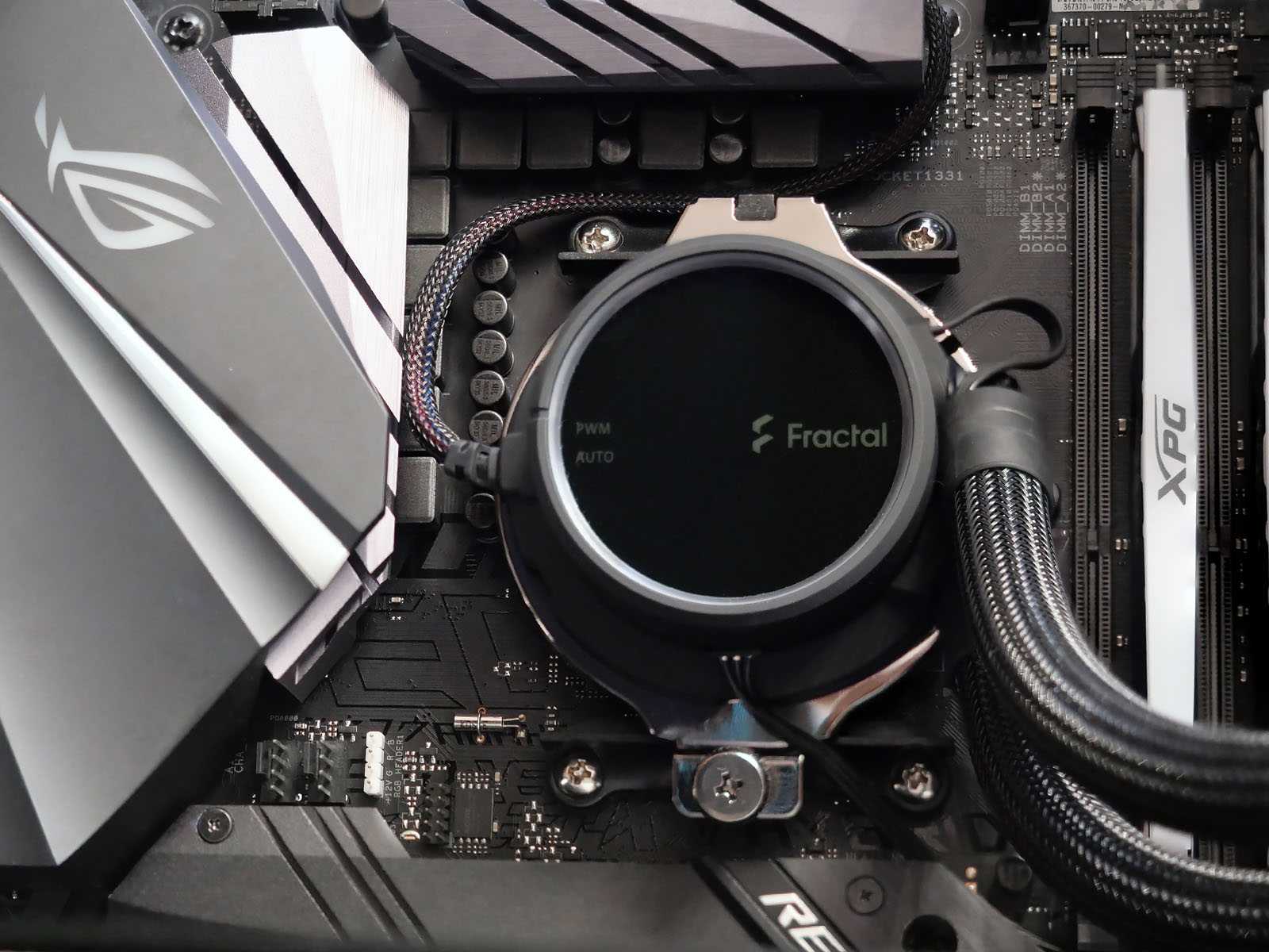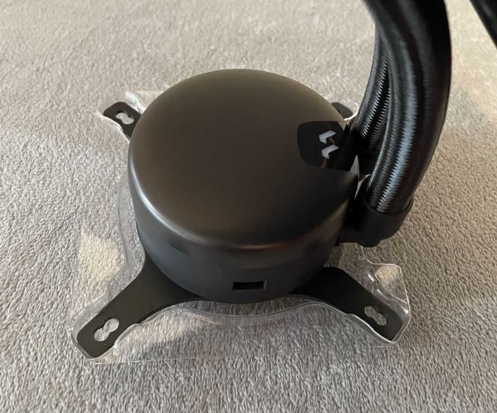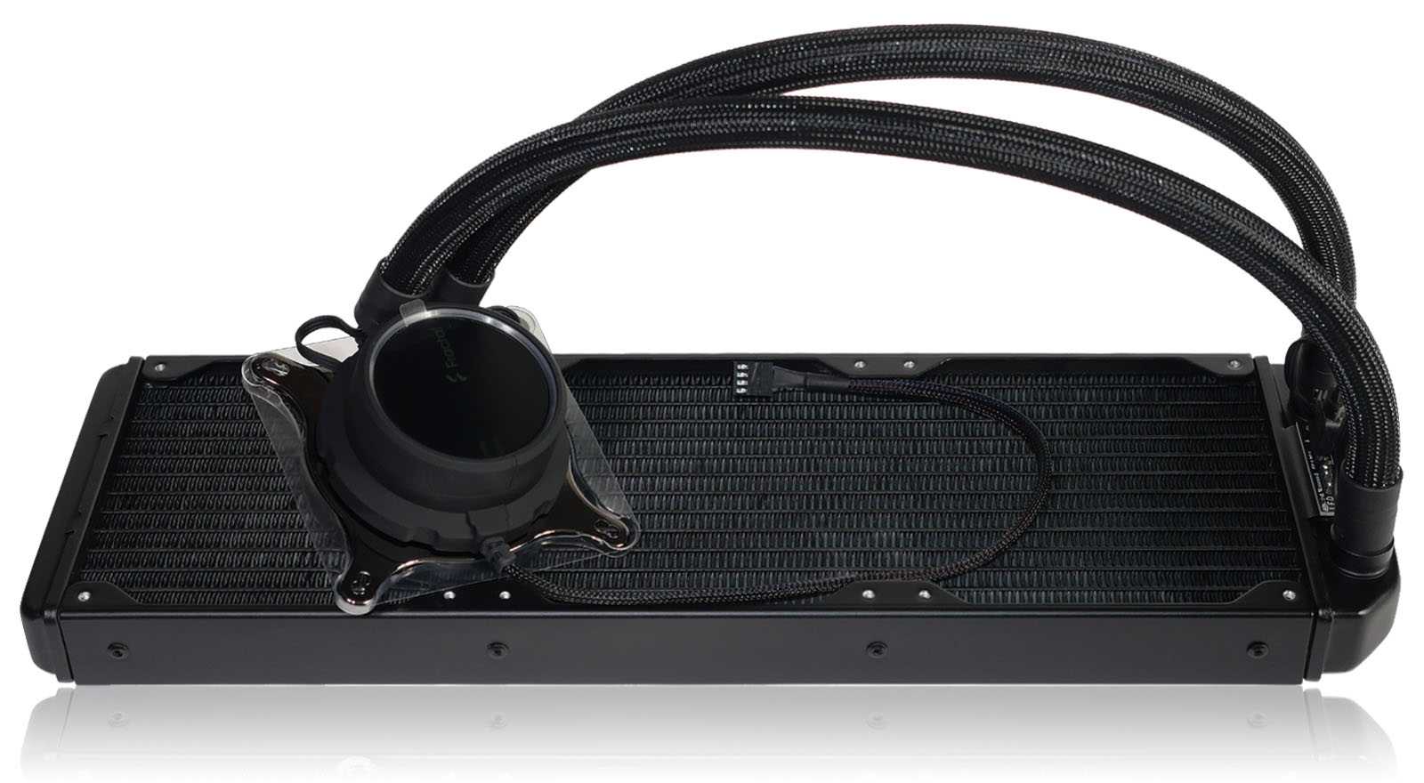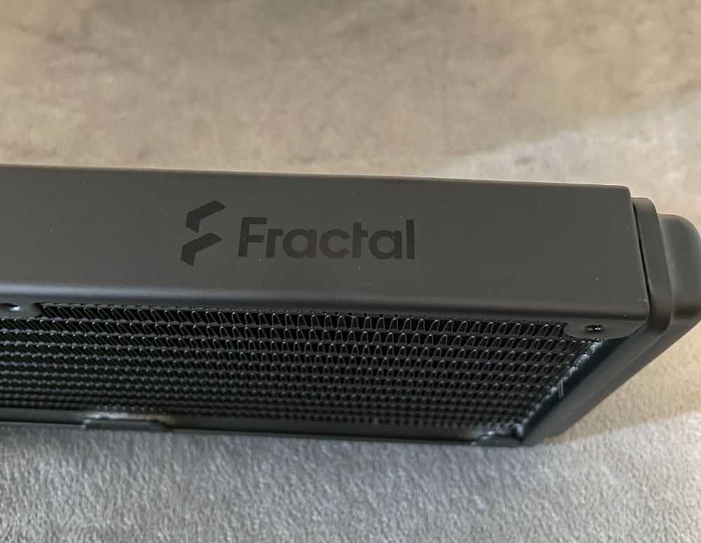 While not as bold as a chrome sticker, or bright white letters, Fractal still wanted to put their name on both halves of the AIO so that no matter where you look, you at least see the stylized «F» logo. Opting for the matte finish on the radiator made it easy to add in a stealth maker’s mark; just by using a shinier black, they can sneak their name onto the sides of the radiator.