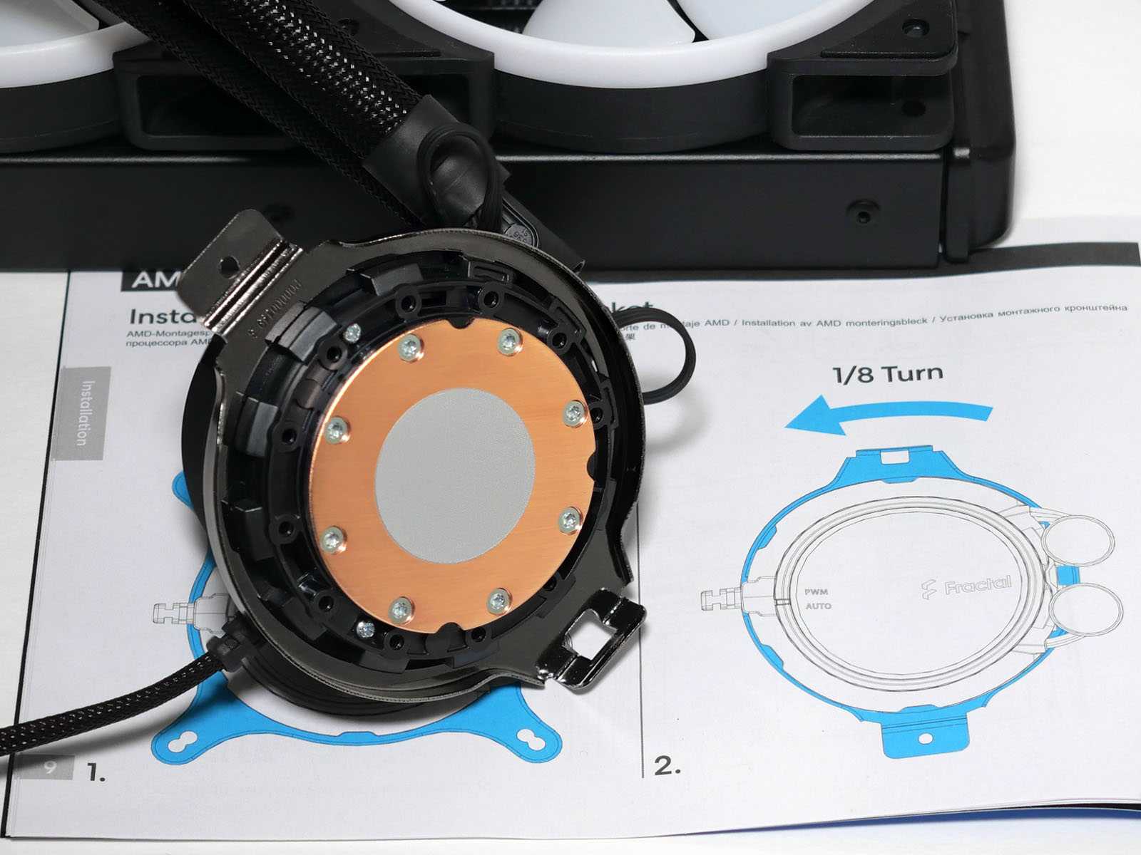 Процесс подготовки к установке на распространенные сокеты AMD и Intel наглядно показан в цветной инструкции. Всё понятно по иллюстрациям, несмотря на отсутствие перевода текстового сопровождения на русский язык.