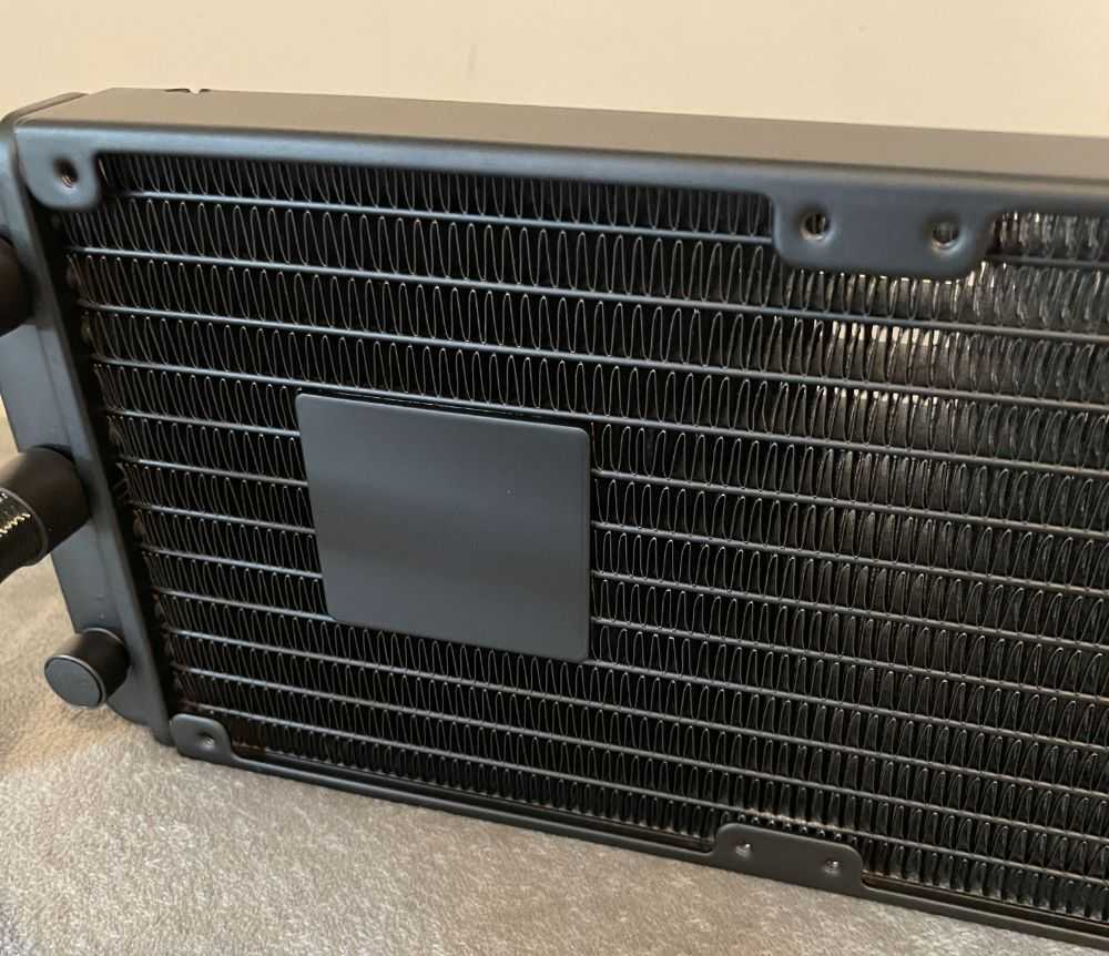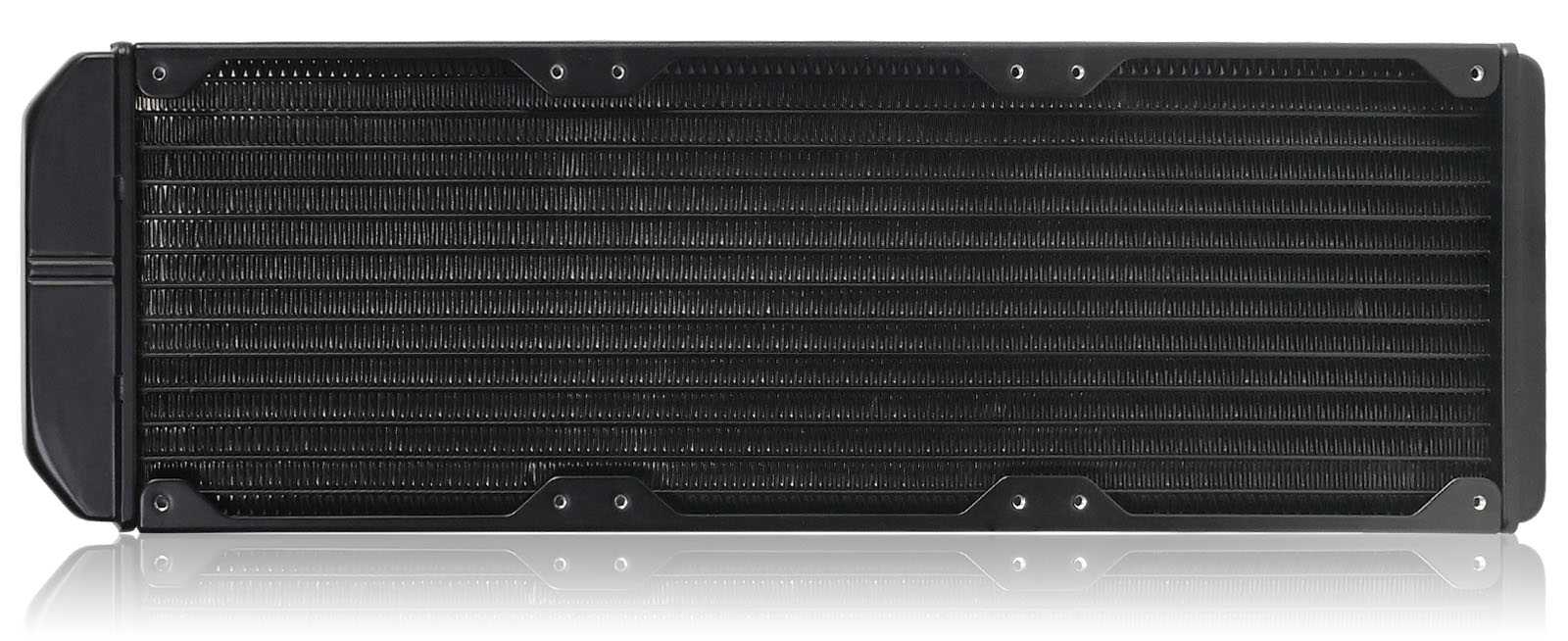 Алюминиевый радиатор рассчитан на установку в комбинации с тремя 120-мм вентиляторами и, за счет служебных выступов для закольцовывания каналов и подведения шлангов, имеет общую длину — 403 мм. Высота каркаса радиатора в 30 мм чуть больше «стандартных» 27 мм