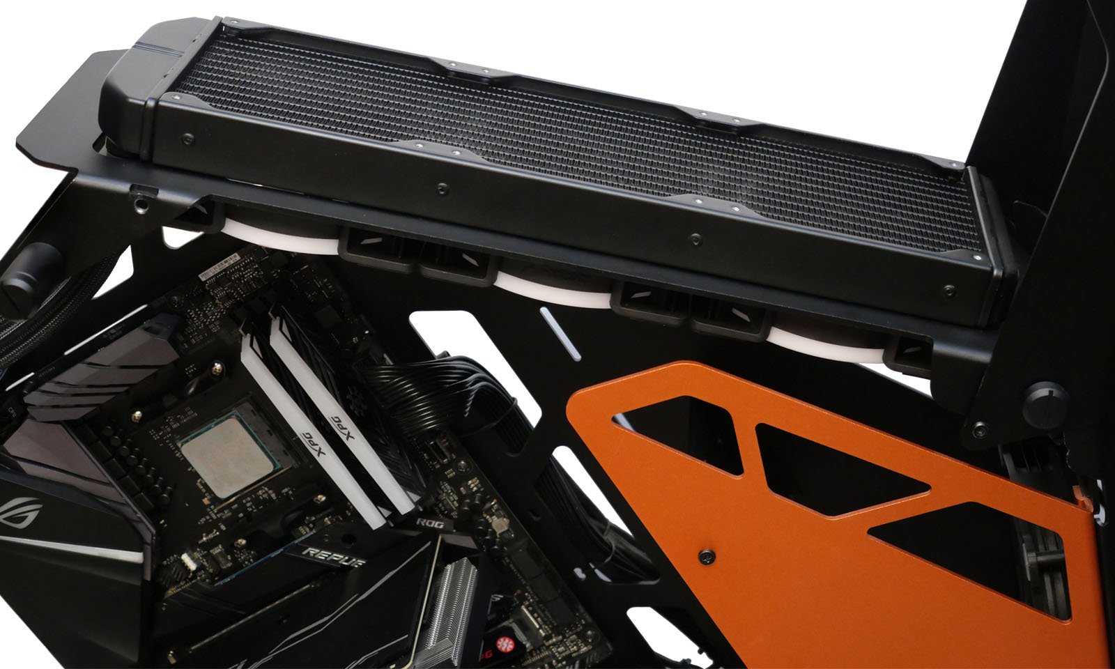 В толстостенных корпусах премиум-сегмента необходимо заранее озаботиться удлиненными винтами для фиксации радиатора или закрепить его вентиляторными длинными винтами по схеме «вентилятор → стенка ПК → радиатор», что и было сделано.