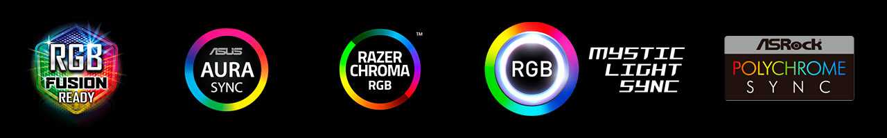 Синхронизация возможна только при наличии управляющих разъемов с питанием +5 В на материнской плате или при использовании внешнего ARGB-контроллера. Заявлена совместимость с ASRock Polychrome Sync, ASUS AURA Sync, Gigabyte RGB Fusion, MSI Mystic Light Sync и Razer Chroma RGB.