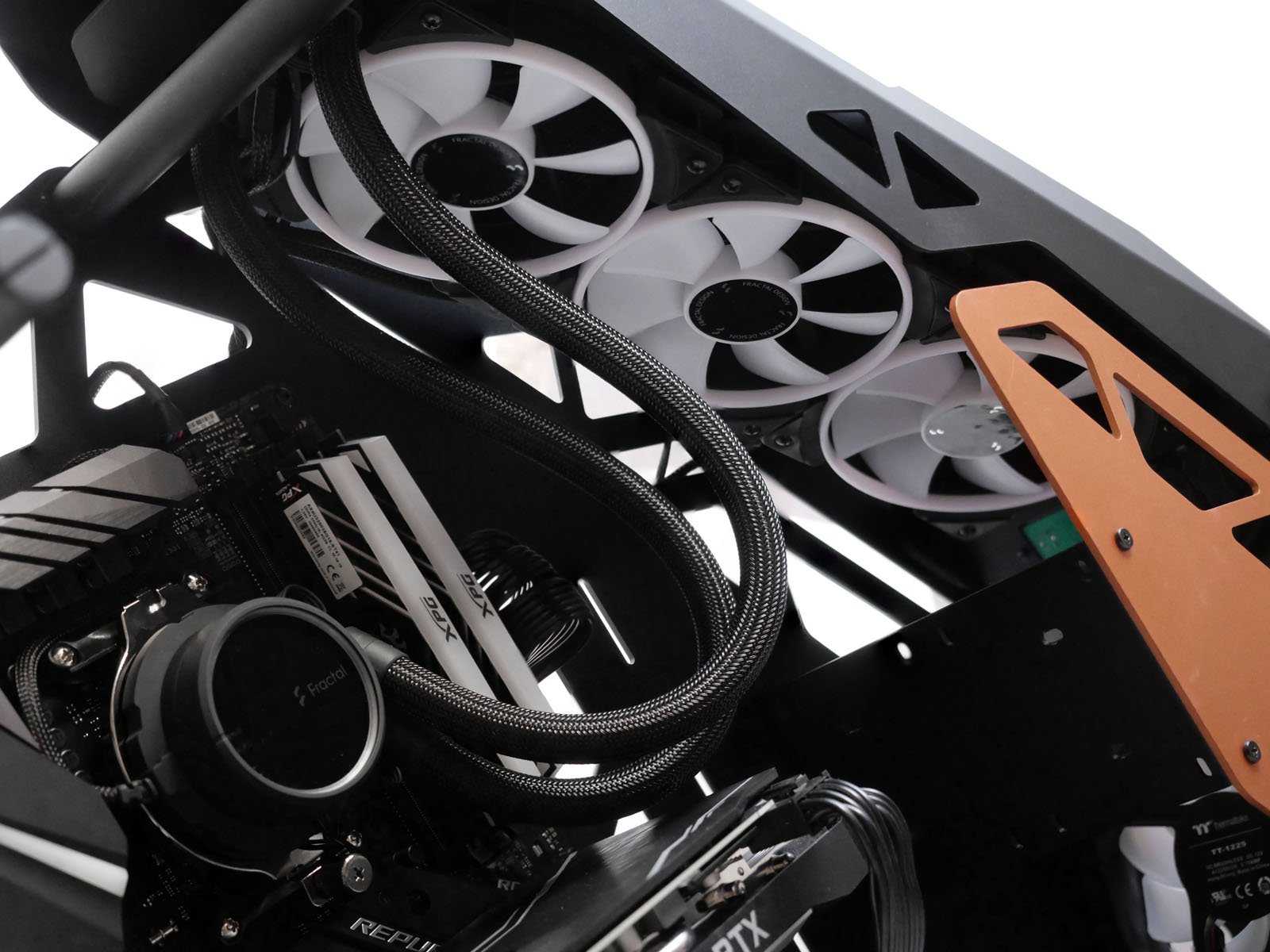 - Аккуратно спрятанные под оплетку шлангов удлинительные кабели вентиляторов;