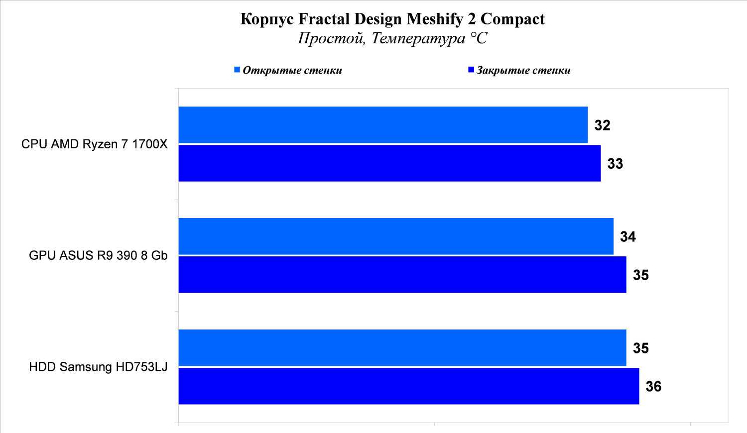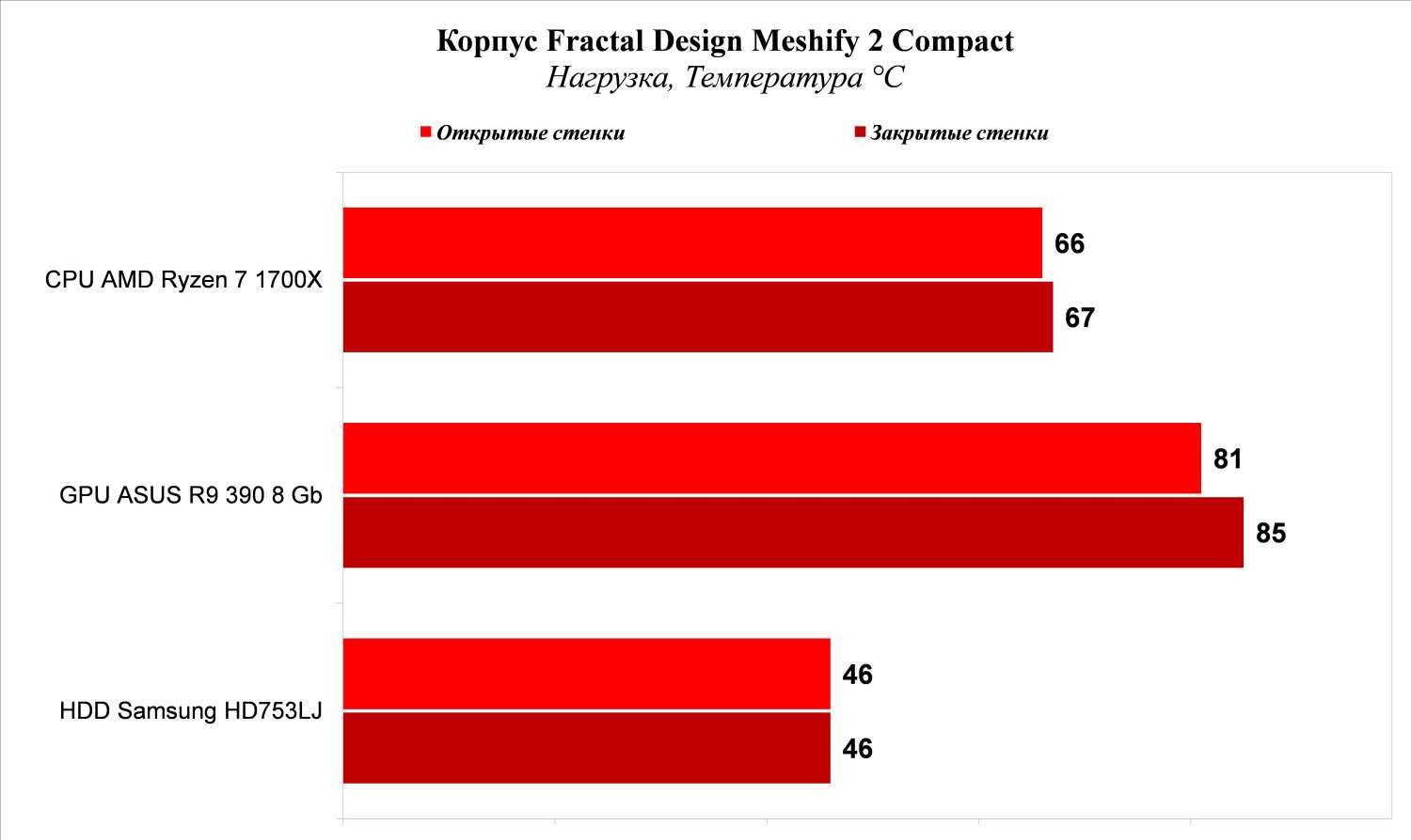 Результаты говорят сами за себя: продувка центральной зоны у корпуса Fractal Design Meshify 2 Compact очень хорошая. Так, разница в результатах с закрытыми и открытыми боковыми стенками составляет: для процессора AMD Ryzen 7 1700X – 1 °С, для видеокарты ASUS Radeon R9 390 8Gb – 4 °С. Весьма неплохие показатели. И только пространство под кожухом осталось без активного охлаждения в штатной конфигурации, жесткий диск Samsung HD753LJ, перекрываемый кабелями, нагревается более высокого значения 46 °С, что исключает использование нескольких накопителей в нижней корзине, так они просто будут греть друг друга.