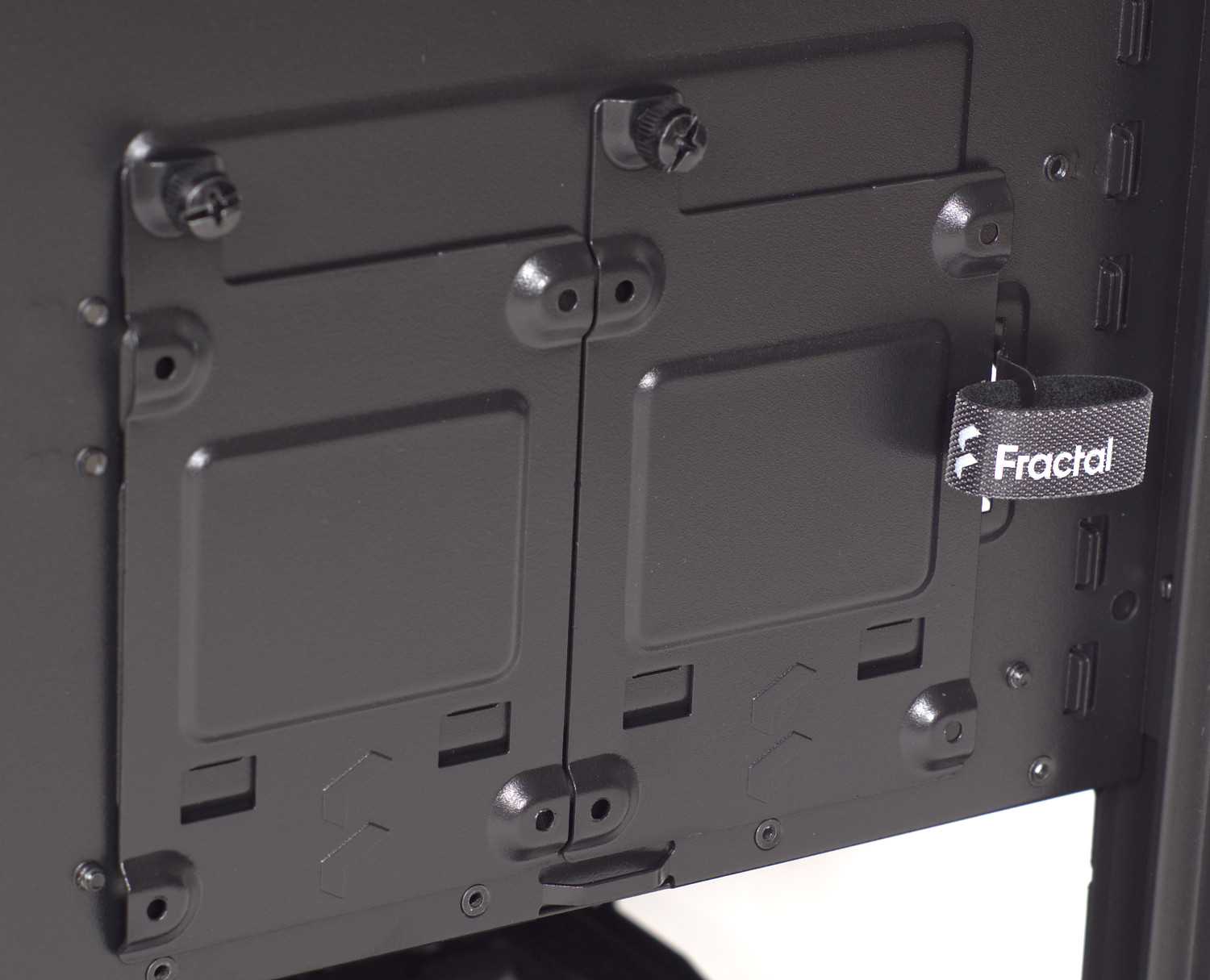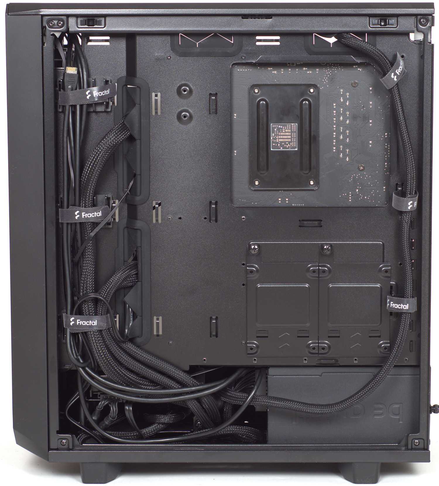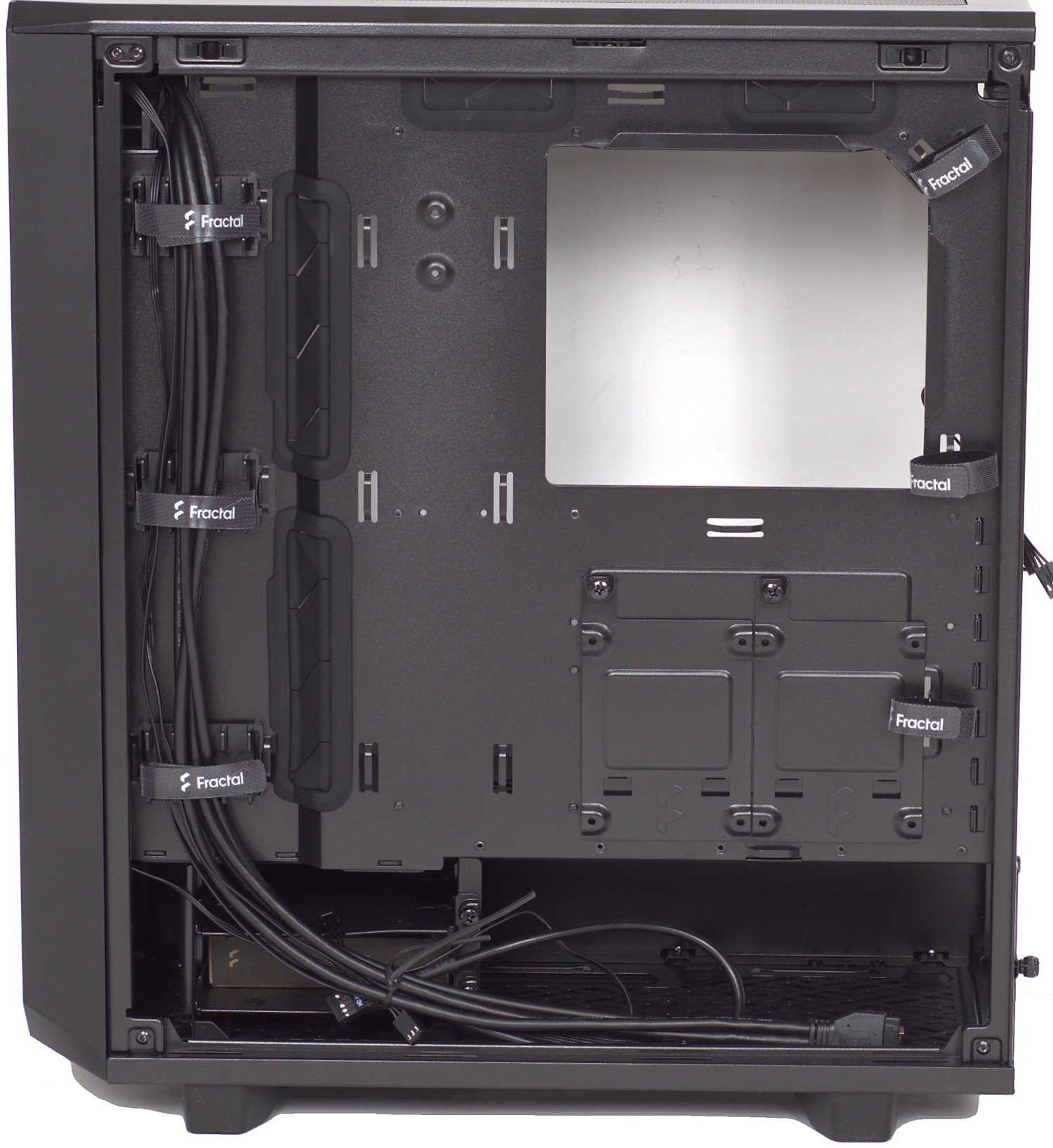 To make cabling easier, Fractal Design machined some holes around the motherboard tray for cables to pass through. These are lined in rubber to help prevent cables getting nicked on sharp edges of metal and to help hide wires on the right side of the case. The holes for this purpose are well-placed, and it makes getting everything in place quite easy. Also, Velcro ties are pre-installed behind the motherboard tray to help you keep wires routed neatly, though the solid panel on this side of the case does let you hide your cable troubles.